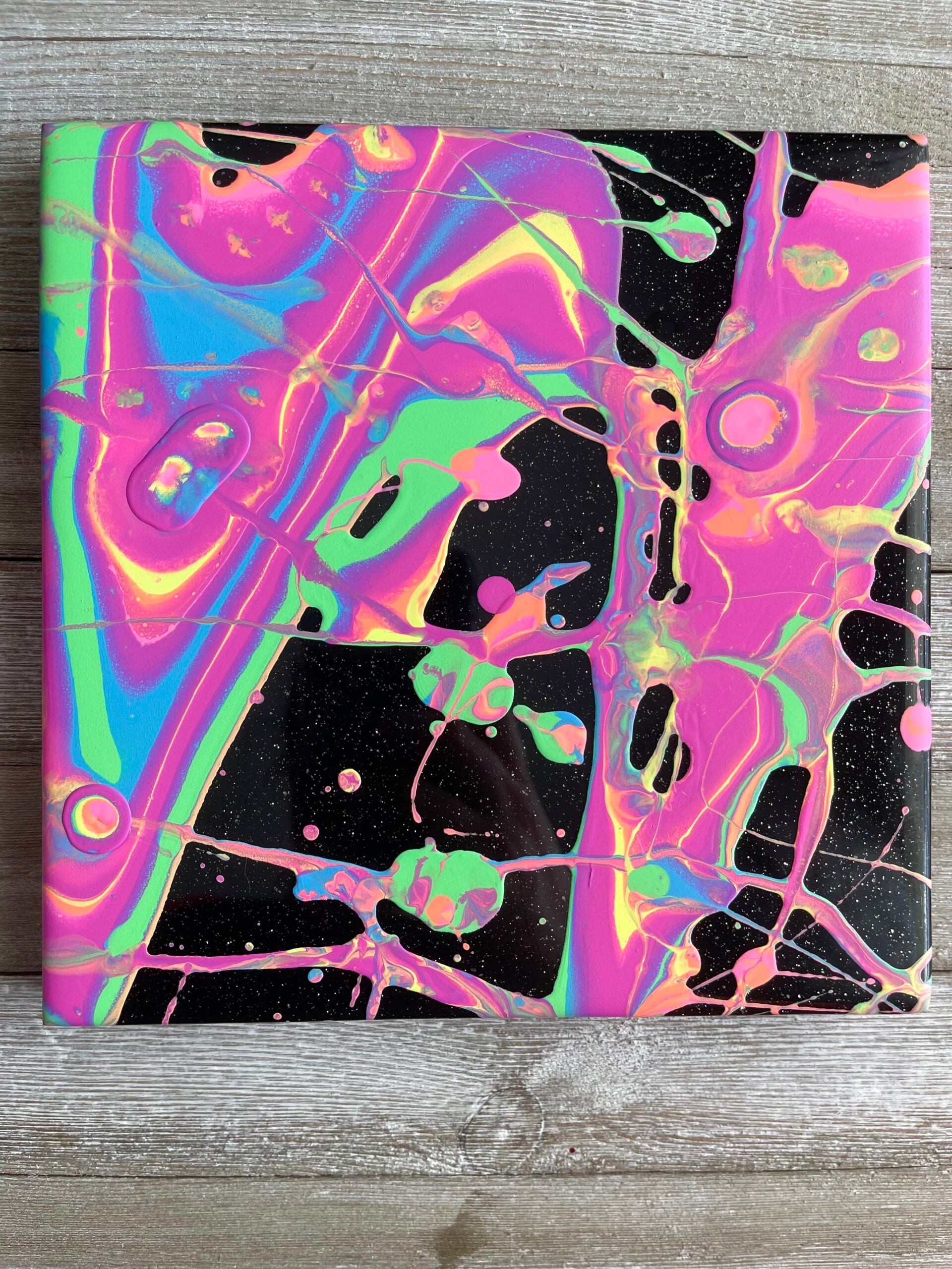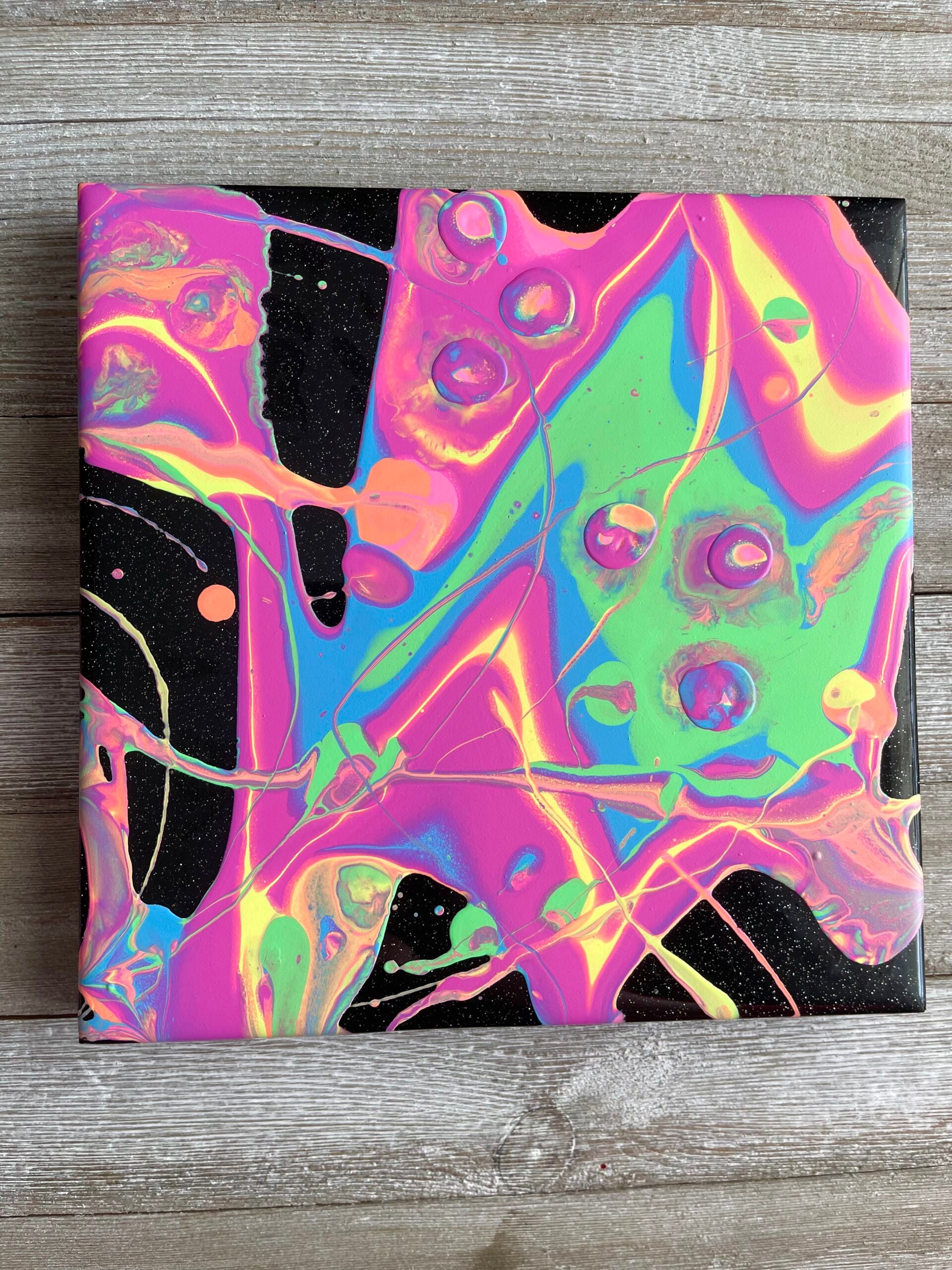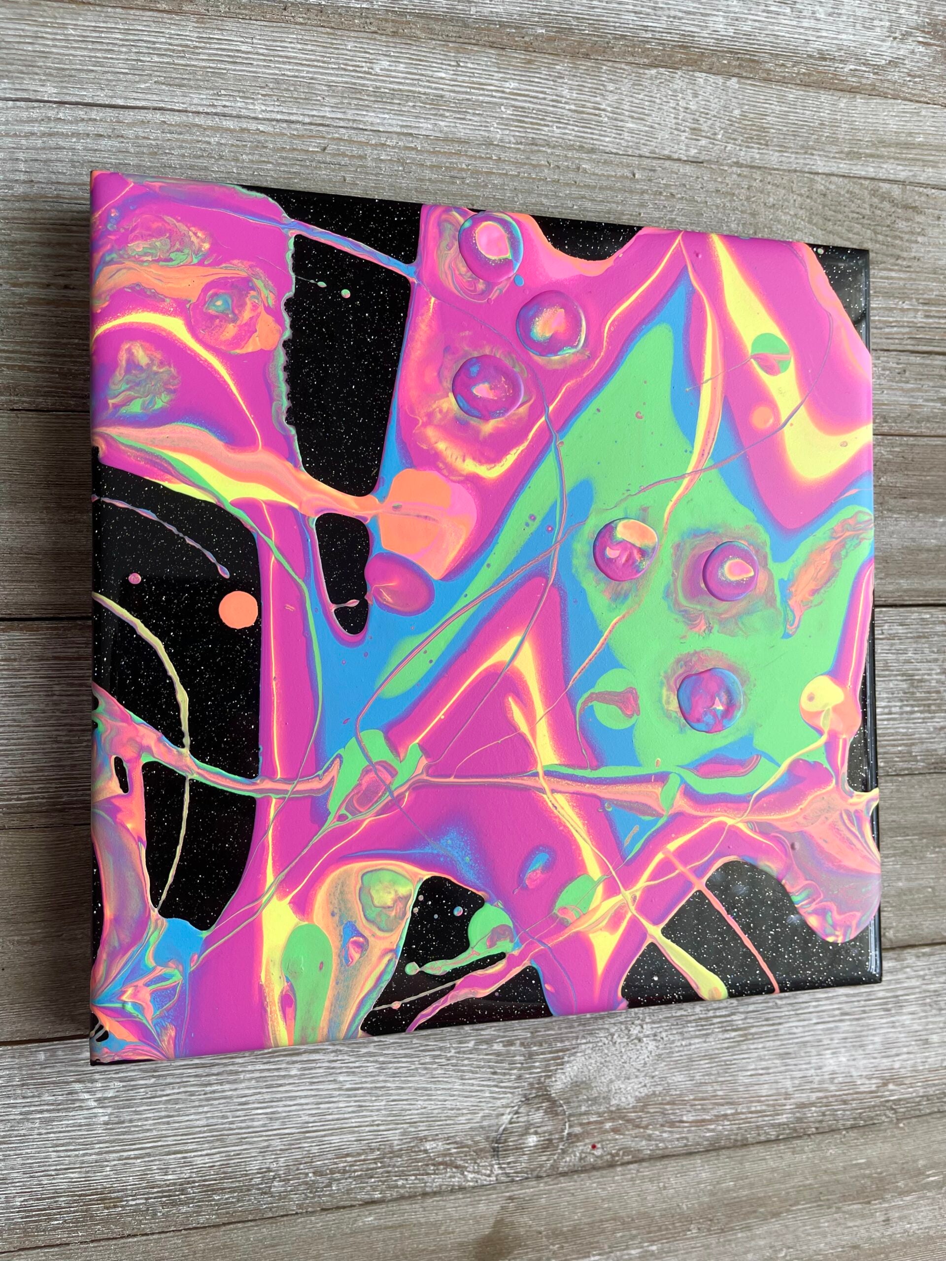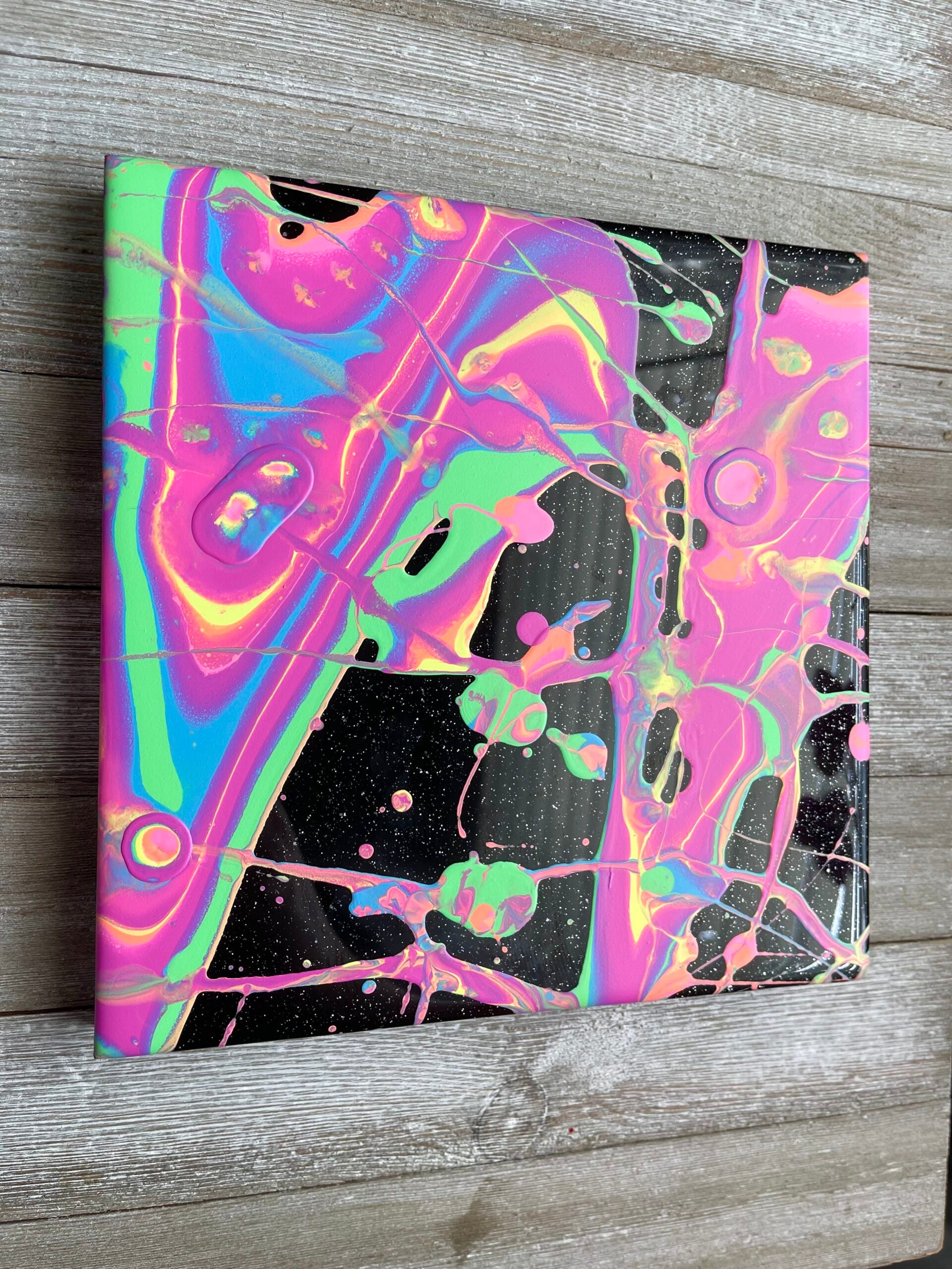 A Bespattered Facade triptych original, consisting of three (3) 8-inch square glittery resin-covered wood panels, sealed with archival-quality, UV-protectant clear varnish and finished with dust protector and hanging hardware.