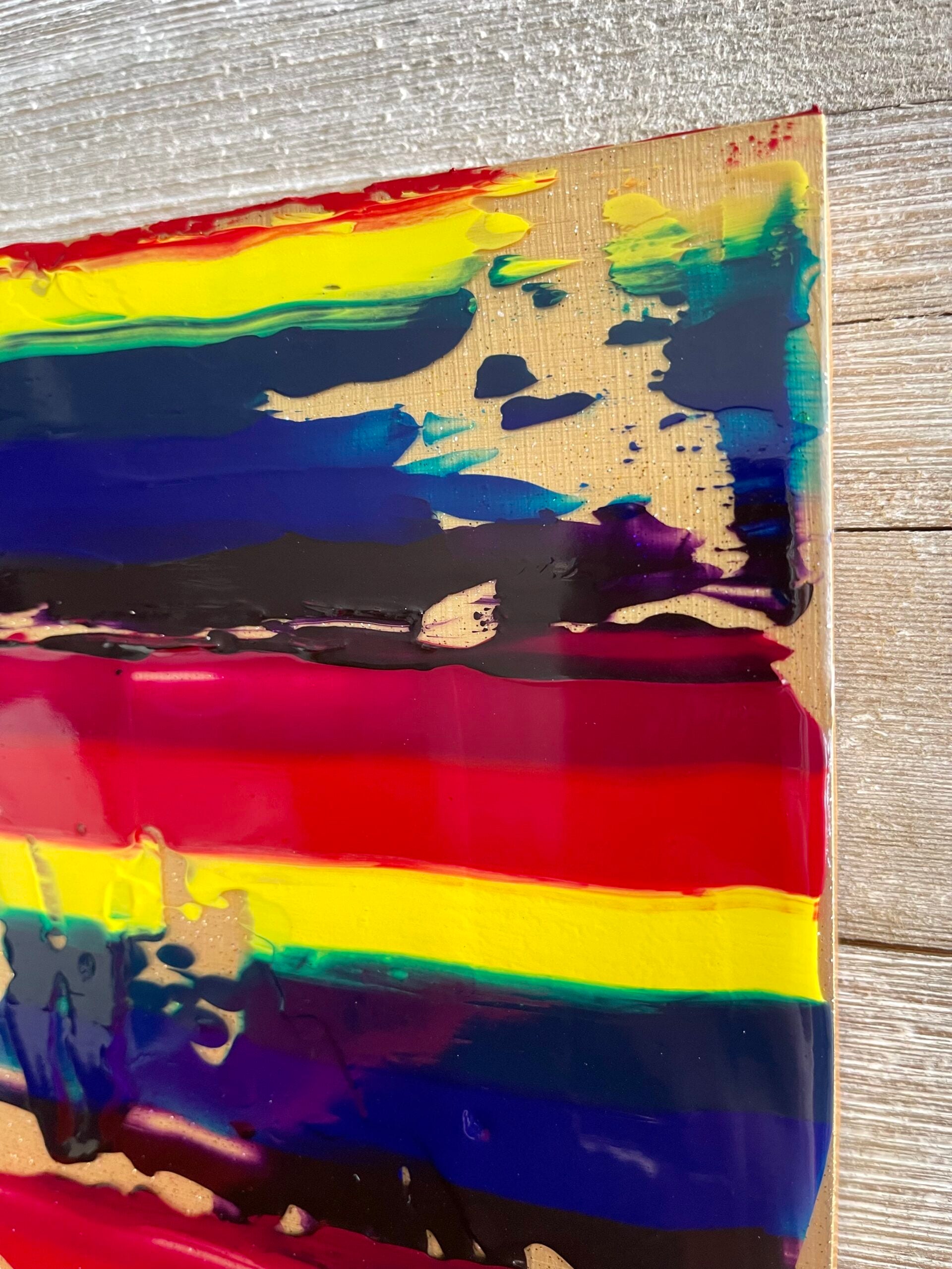 A Bespattered Facade original on a 8-inch square glittery resin-covered wood panel, sealed with archival-quality, UV-protectant clear varnish and finished with dust protector and hanging hardware.