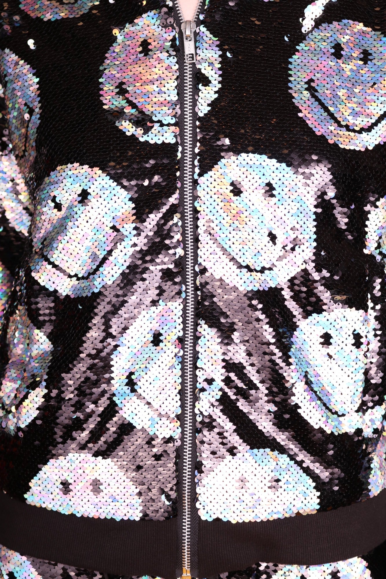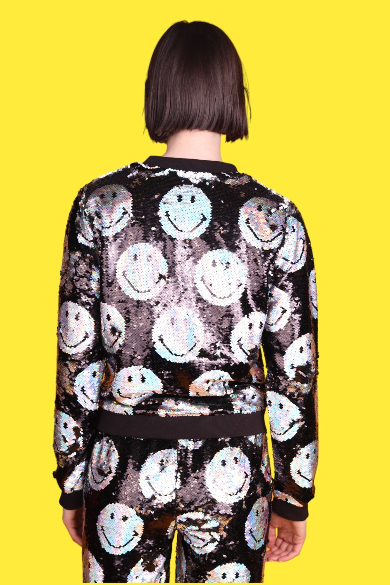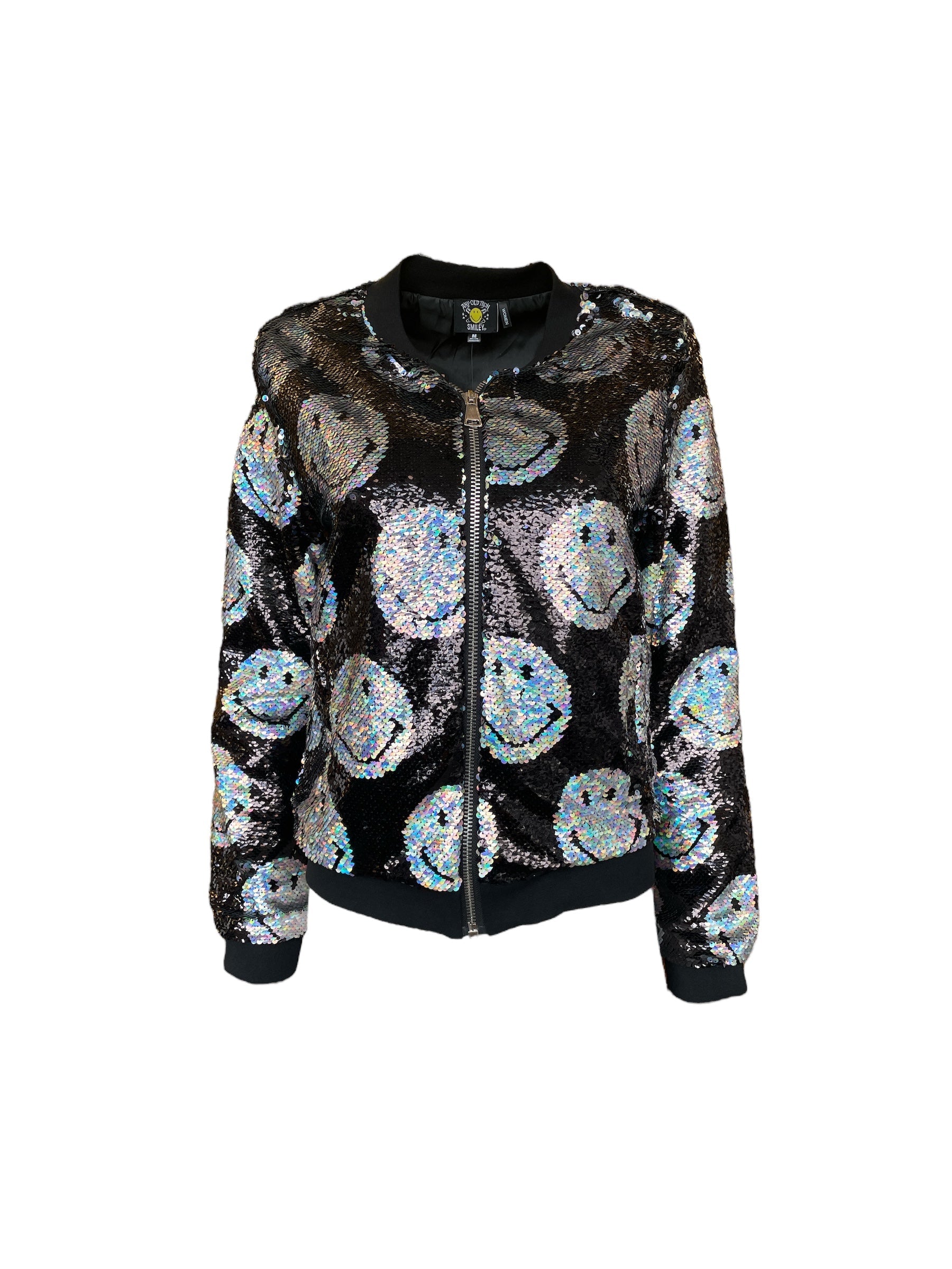 We're all smiles because AOI and Smiley have dropped the sparkliest bomb to date: the Any Old Iron x Smiley Iridescent Bomber Jacket! This iridescent silver and jet black bomber jacket is adorned with a reversible sequin, smiley pattern from the front to the back, which flips the smiley faces from a holographic silver to a jet black. Along the waistline of the jacket, two exterior pockets can be found to stow away any essentials you may need throughout the day and evening. Within the interior of the jacket, you will be met with a silky smooth fabric, which aids in ventilation and comfortability. Needless to say, this jacket has it all-except someone to share a smile with!