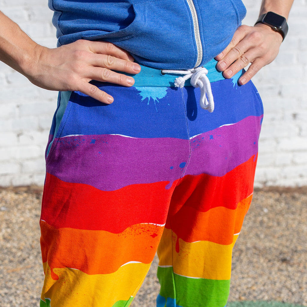 Red, orange, yellow, green, blue, purple - a rainbow of stripes is painted across these fun, funky joggers, complete with drips and splatters. Accented with sky blue pockets, waistband, and cuffs, they bring sunny cheer to chase away winter blahs. Blue flat tape cotton ties make for a comfortable, adjustable waist. Made of the comfiest fuzzy polyester fleece interior with a smooth cotton exterior. 63% cotton/37% polyester.