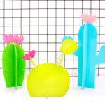 Acrylic cactus trio. Slot together and add pink cactus blossoms to each. Measure appx 4” wide by 6” to 9” tall. Shades of green and turquoise.