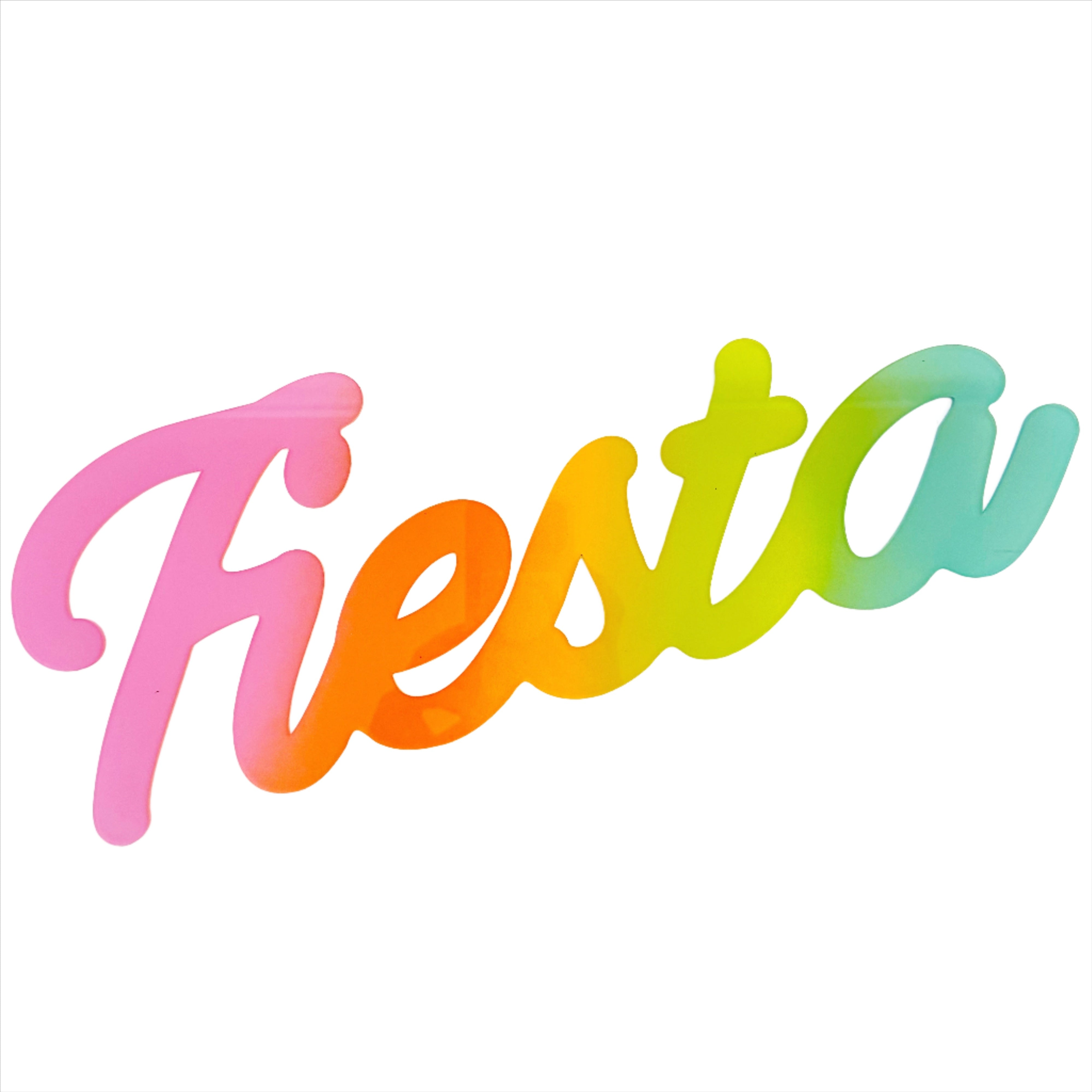 Acrylic Fiesta Sign. Measures appx. 16" long by 6" tall. Comes with 2 clear stands to display on a shelf or table. Can also be hung with command strips.