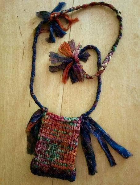 Just need something small to hold your phone and a few other items? This is a super swift knit that will do the trick! This bag knits up super fast in a stockinette stitch and takes just one skein of gorgeous chiffon ribbon yarn. Sling it over your shoulder to take to a concert, out to a day at the museum, or for a quick trip to the store.
