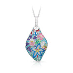 Capture the joy of a blooming garden with the Fleurette Pendant. This exquisite piece features a graceful, organic shape, creating the perfect canvas for a vibrant floral tapestry. A garden of 'fleurettes,' or little flowers, comes to life in a kaleidoscope of hand-painted translucent Italian enamel, with jewel-toned blossoms blooming against a serene turquoise sky.