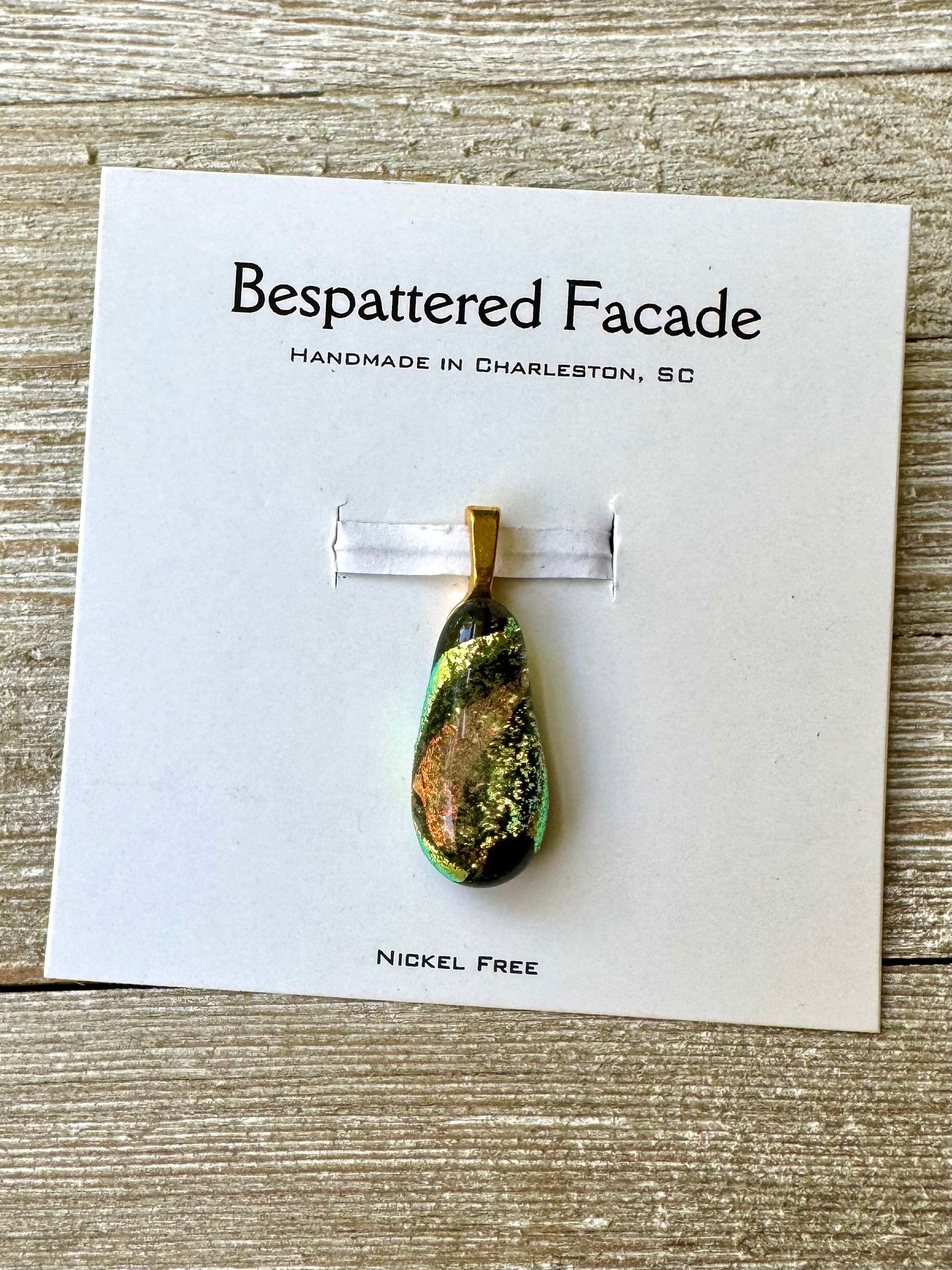 All Magic Drop pendants are made of dichroic glass; the findings are made of nickel-free stainless steel. Dichroic means "two colors" and when this glass is viewed from different angles it shifts between multiple iridescent colors. Each piece is truly one of a kind, and dichroic glass is difficult to photograph due to its unique properties, please expect slight differences in color and pattern. You will receive the exact pendant pictured, and they're much more dramatic in person.