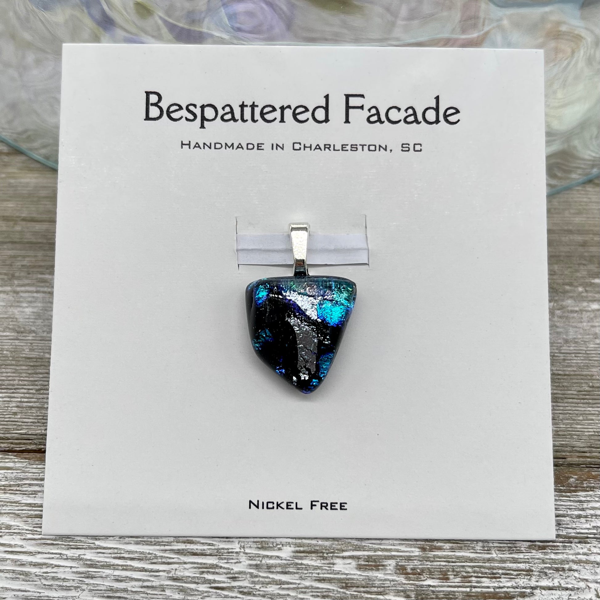 All Magic Drop pendants are made of dichroic glass; the findings are made of nickel-free stainless steel. Dichroic means "two colors" and when this glass is viewed from different angles it shifts between multiple iridescent colors. Each piece is truly one of a kind, and dichroic glass is difficult to photograph due to its unique properties, please expect slight differences in color and pattern. You will receive the exact pendant pictured, and they're much more dramatic in person.