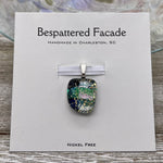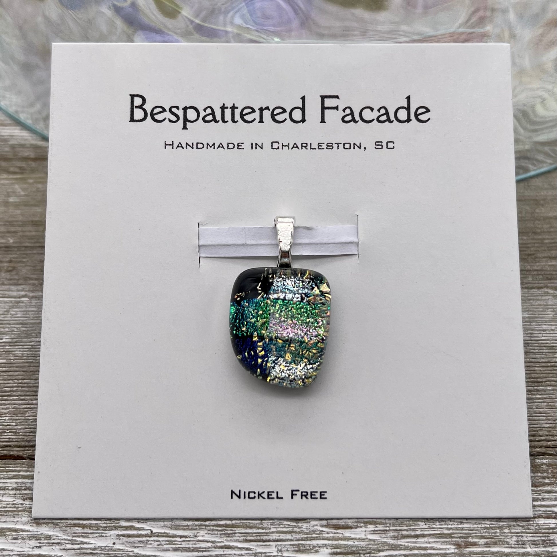 All Magic Drop pendants are made of dichroic glass; the findings are made of nickel-free stainless steel. Dichroic means "two colors" and when this glass is viewed from different angles it shifts between multiple iridescent colors. Each piece is truly one of a kind, and dichroic glass is difficult to photograph due to its unique properties, please expect slight differences in color and pattern. You will receive the exact pendant pictured, and they're much more dramatic in person.