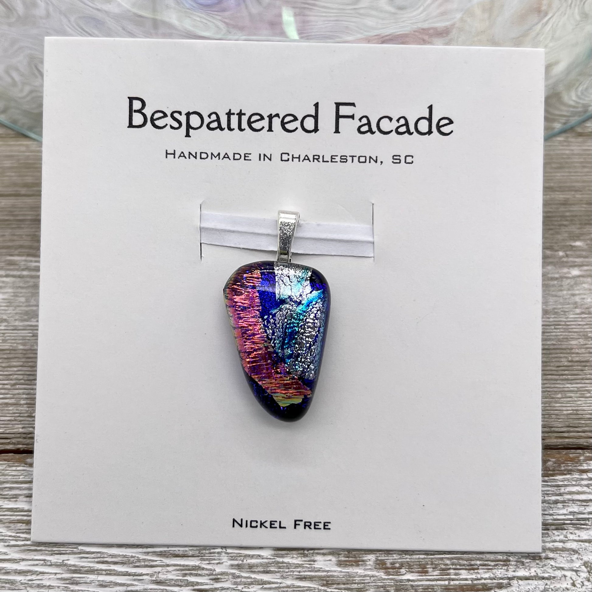All Magic Drop pendants are made of dichroic glass; the findings are made of nickel-free stainless steel. Dichroic means "two colors" and when this glass is viewed from different angles it shifts between multiple iridescent colors. Each piece is truly one of a kind, and dichroic glass is difficult to photograph due to its unique properties, please expect slight differences in color and pattern. You will receive the exact pendant pictured, and they're much more dramatic in person.