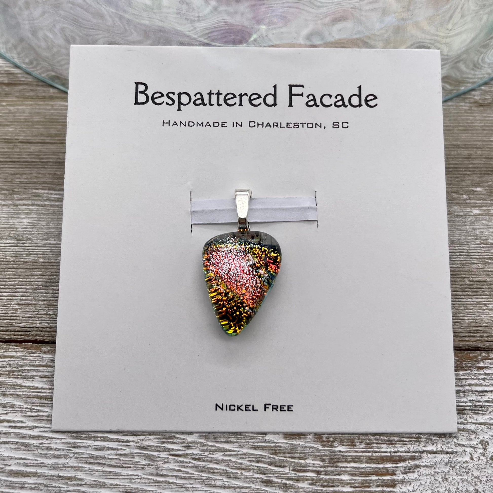 All Magic Drop pendants are made of dichroic glass; the findings are made of nickel-free stainless steel. Dichroic means "two colors" and when this glass is viewed from different angles it shifts between multiple iridescent colors. Each piece is truly one of a kind, and dichroic glass is difficult to photograph due to its unique properties, please expect slight differences in color and pattern. You will receive the exact pendant pictured, and they're much more dramatic in person.