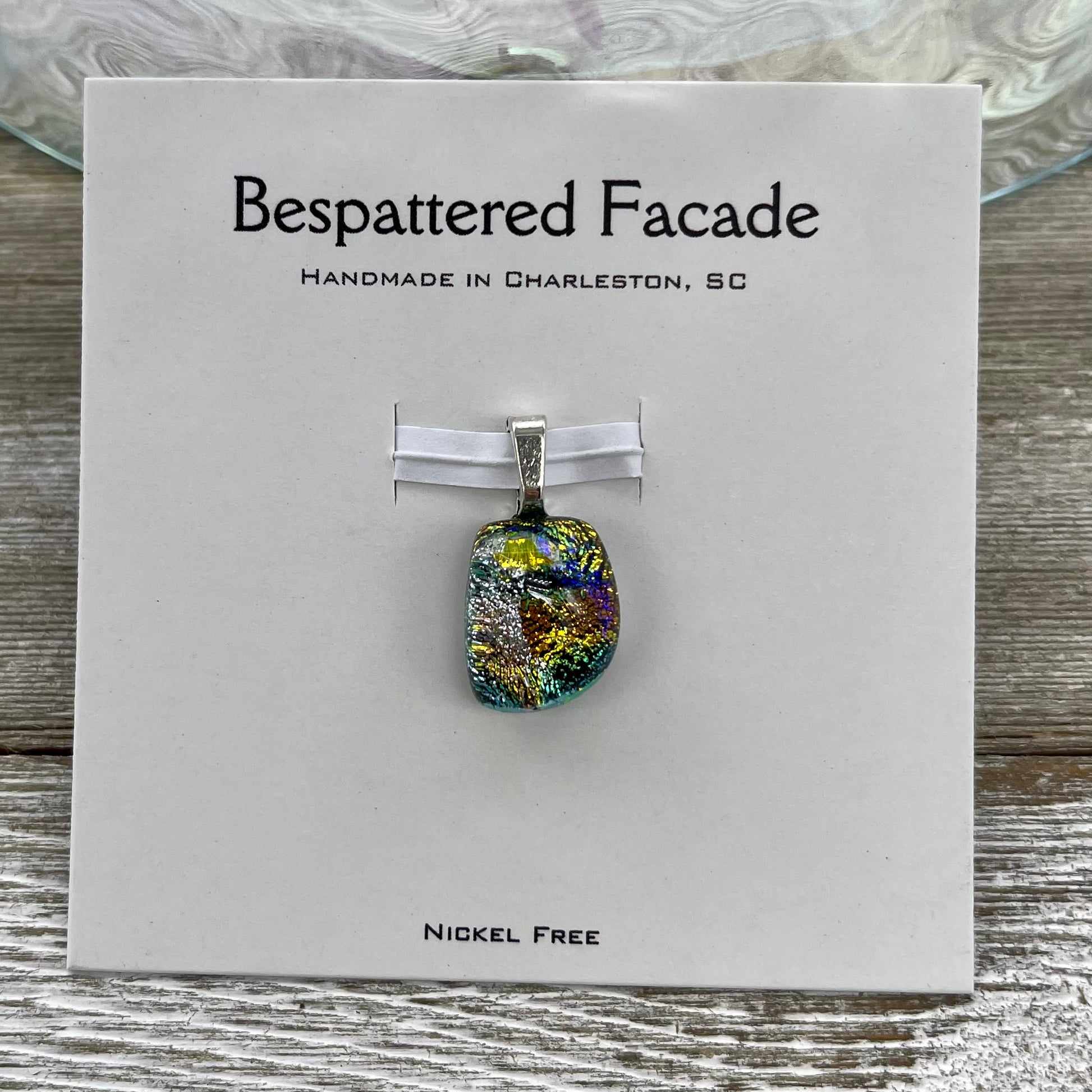 All Magic Drop pendants are made of dichroic glass; the findings are made of nickel-free stainless steel. Dichroic means "two colors" and when this glass is viewed from different angles it shifts between multiple iridescent colors. Each piece is truly one of a kind, and dichroic glass is difficult to photograph due to its unique properties, please expect slight differences in color and pattern. You will receive the exact pendant pictured, and they're much more dramatic in person.