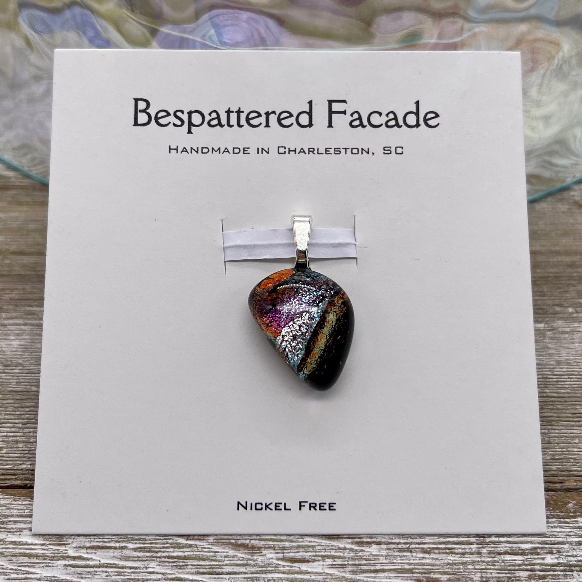 All Magic Drop pendants are made of dichroic glass; the findings are made of nickel-free stainless steel. Dichroic means "two colors" and when this glass is viewed from different angles it shifts between multiple iridescent colors. Each piece is truly one of a kind, and dichroic glass is difficult to photograph due to its unique properties, please expect slight differences in color and pattern. You will receive the exact pendant pictured, and they're much more dramatic in person.