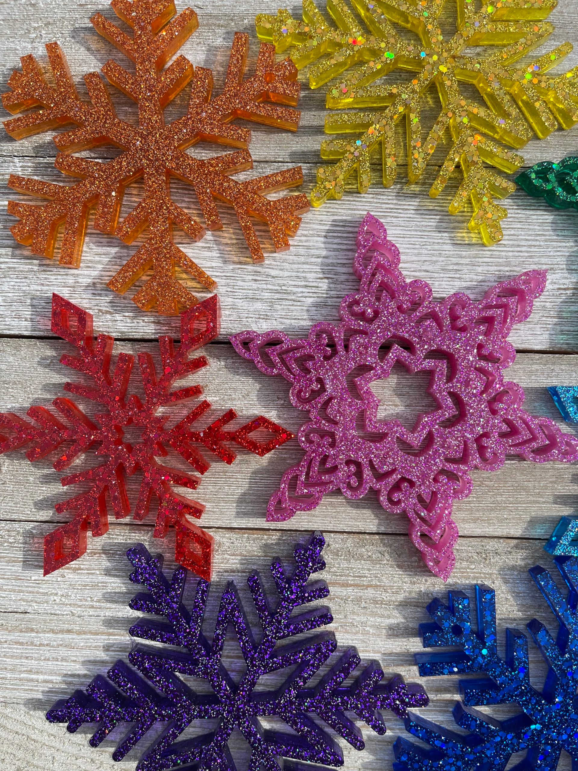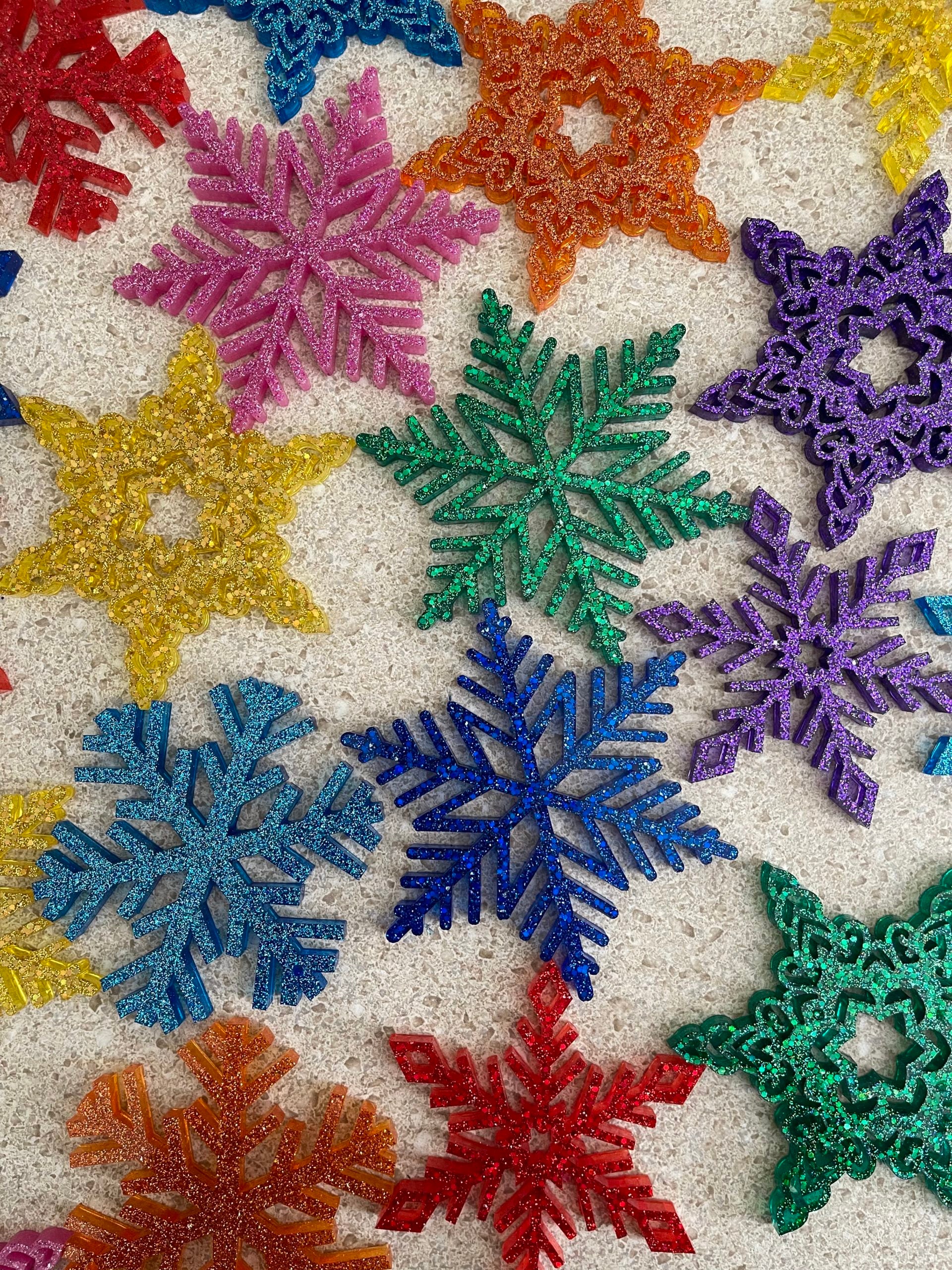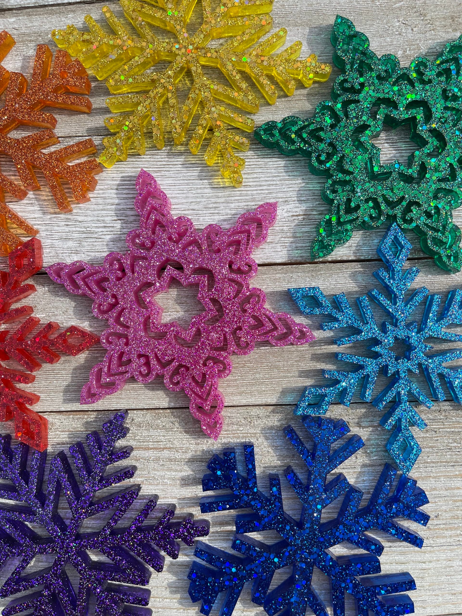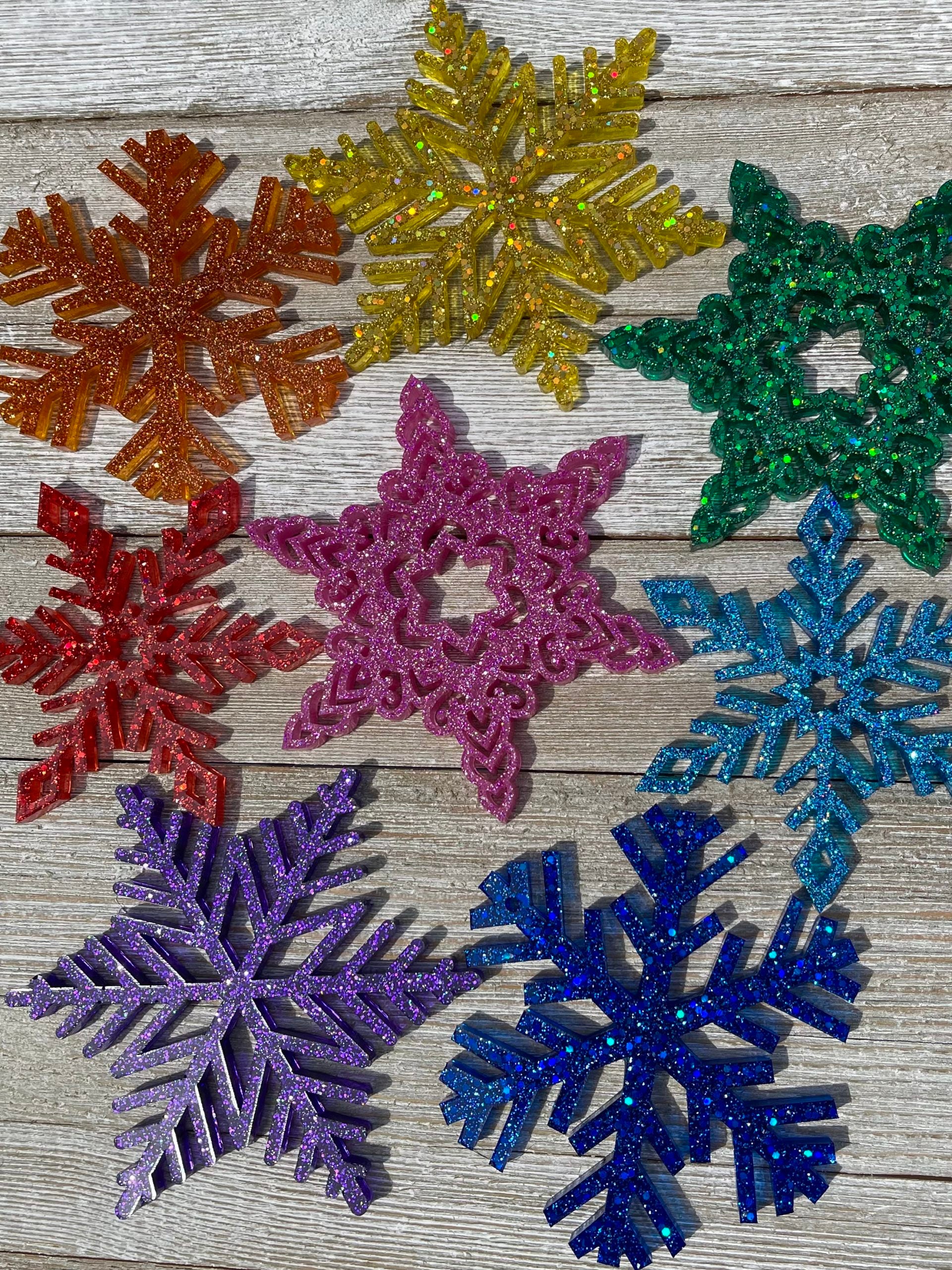 Set includes eight (8) glittery snowflakes in a sparkly range of rainbow colors, hung from a translucent loop, ready to make your holiday decor colorful af. Each set includes four (4) shapes and eight (8) colors: pink, red, orange, yellow, green, blue, indigo, purple. There will be no duplicate colors, but you will receive two (2) of each shape.