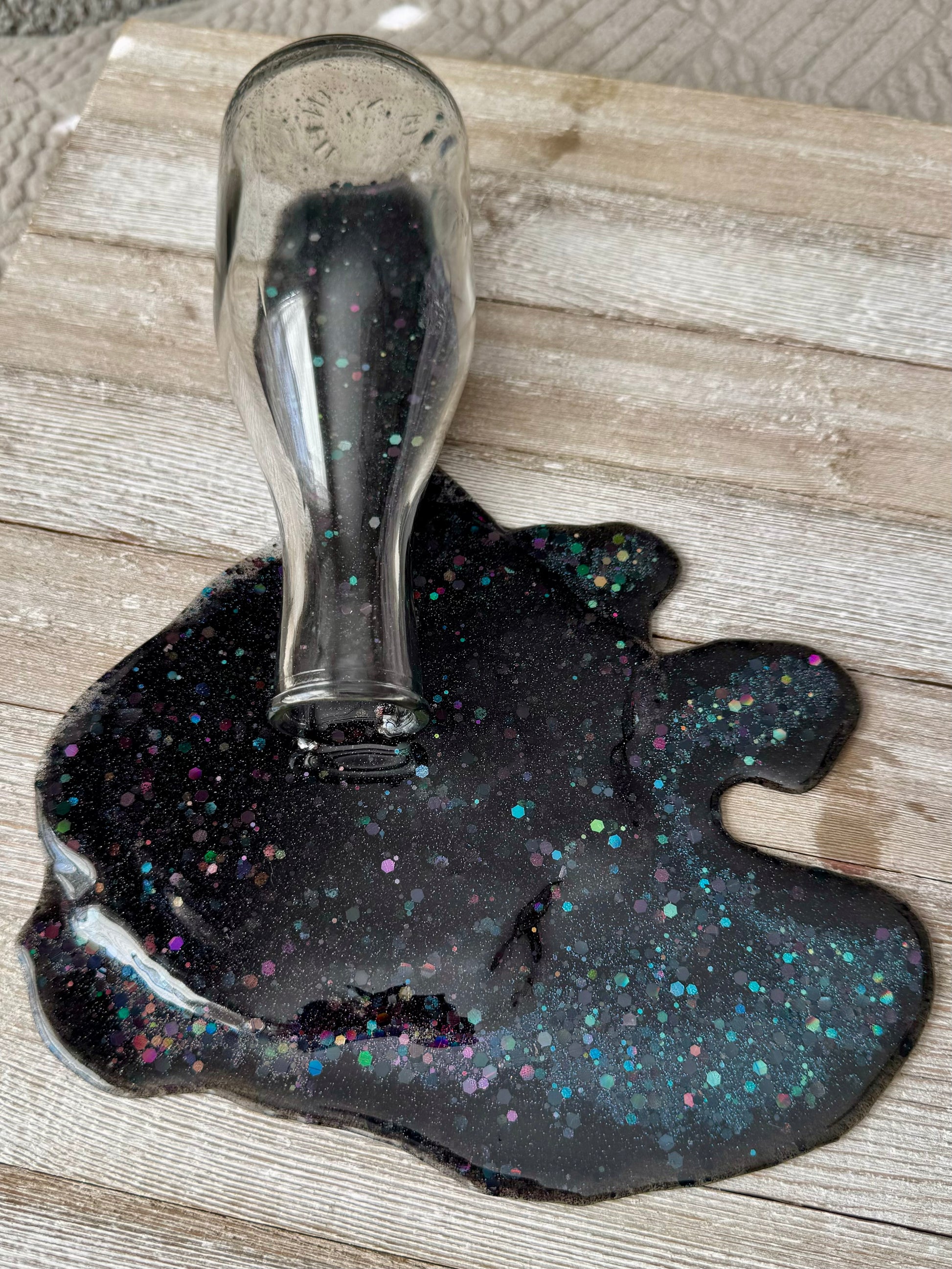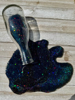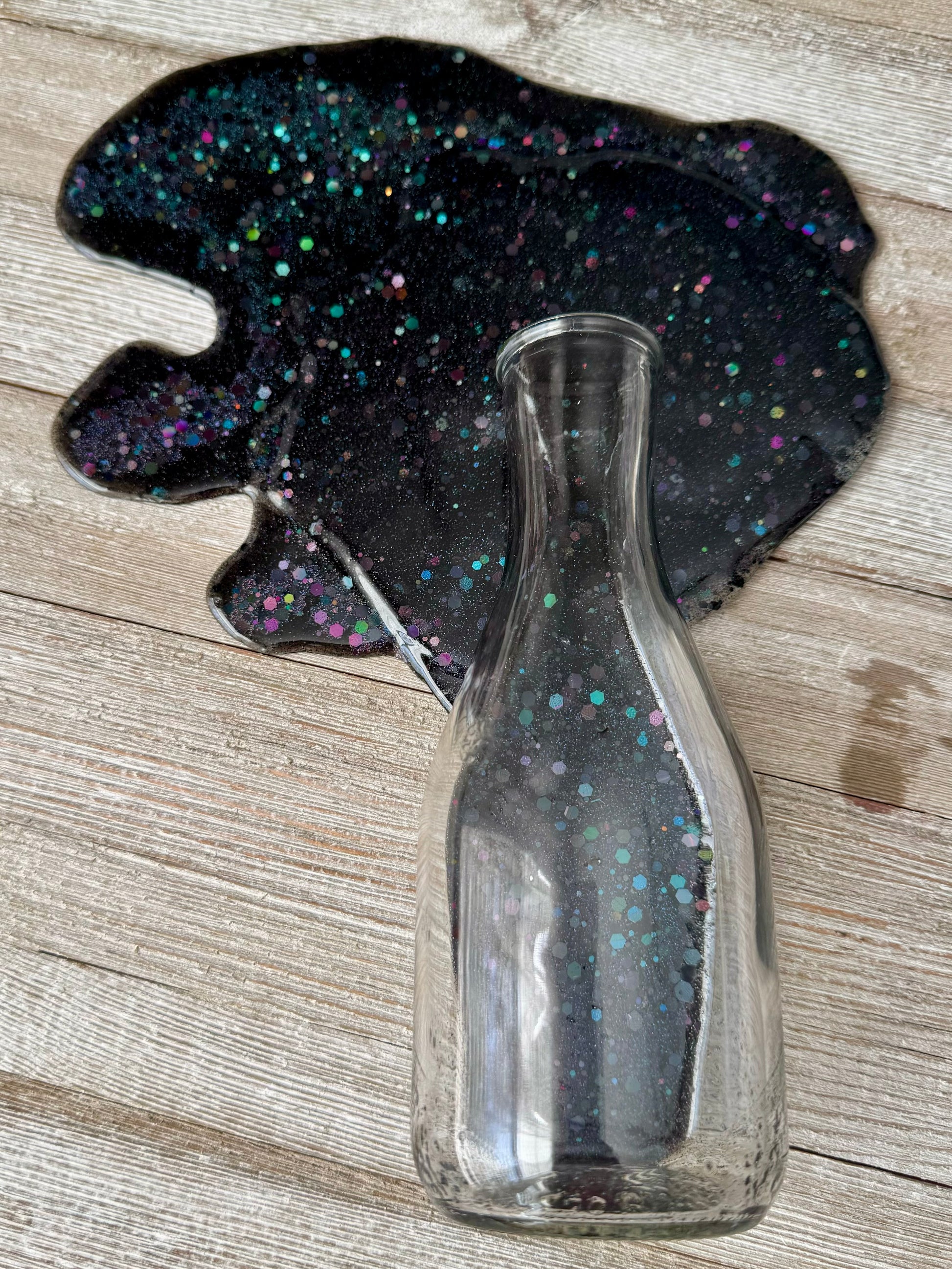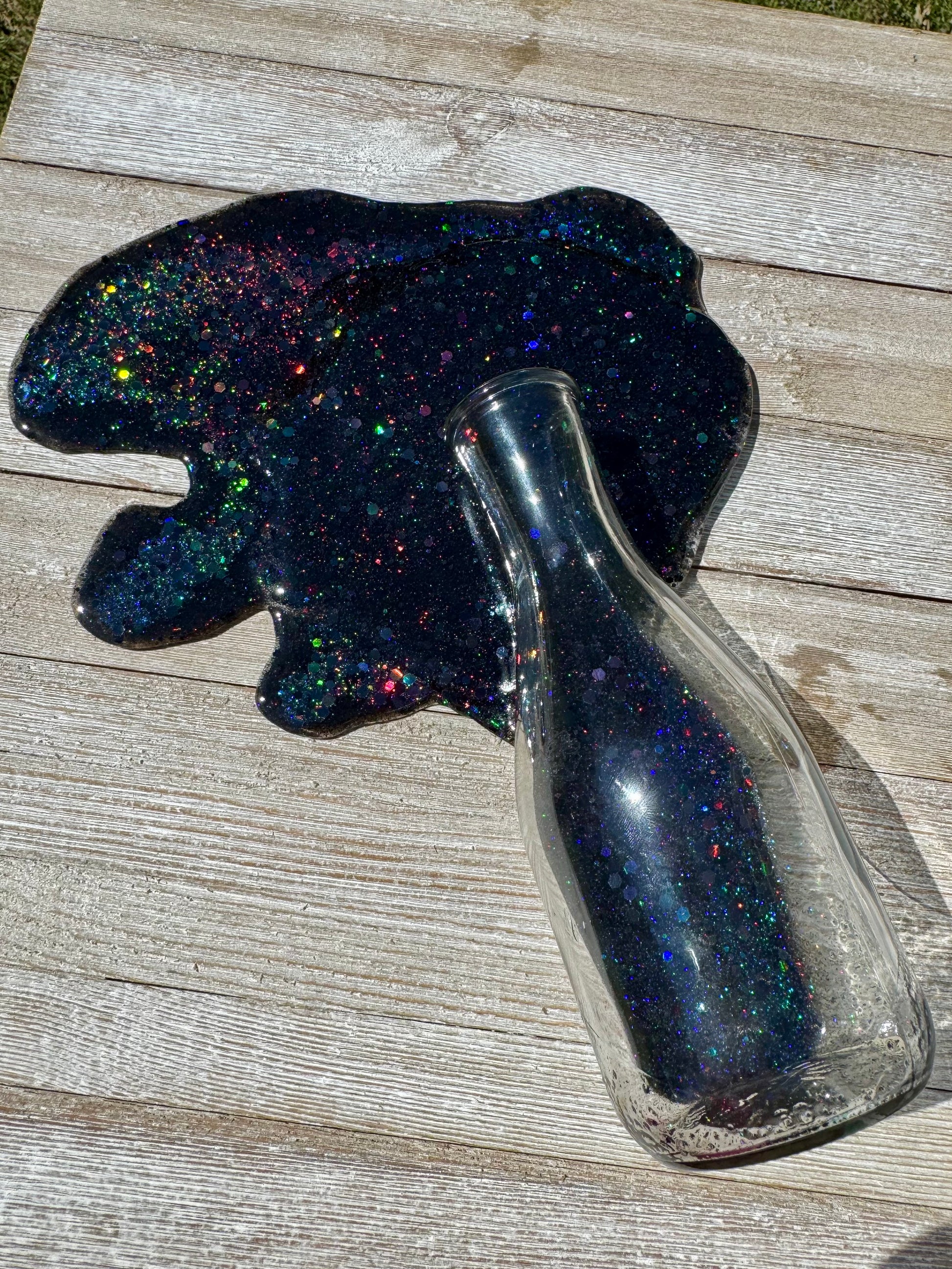 This unique sculpture spills the essence of magic with a glittery iridescent rainbow in inky black resin potion, flowing from a glass bottle. A must-have for any magical (but clumsy) potion enthusiast.