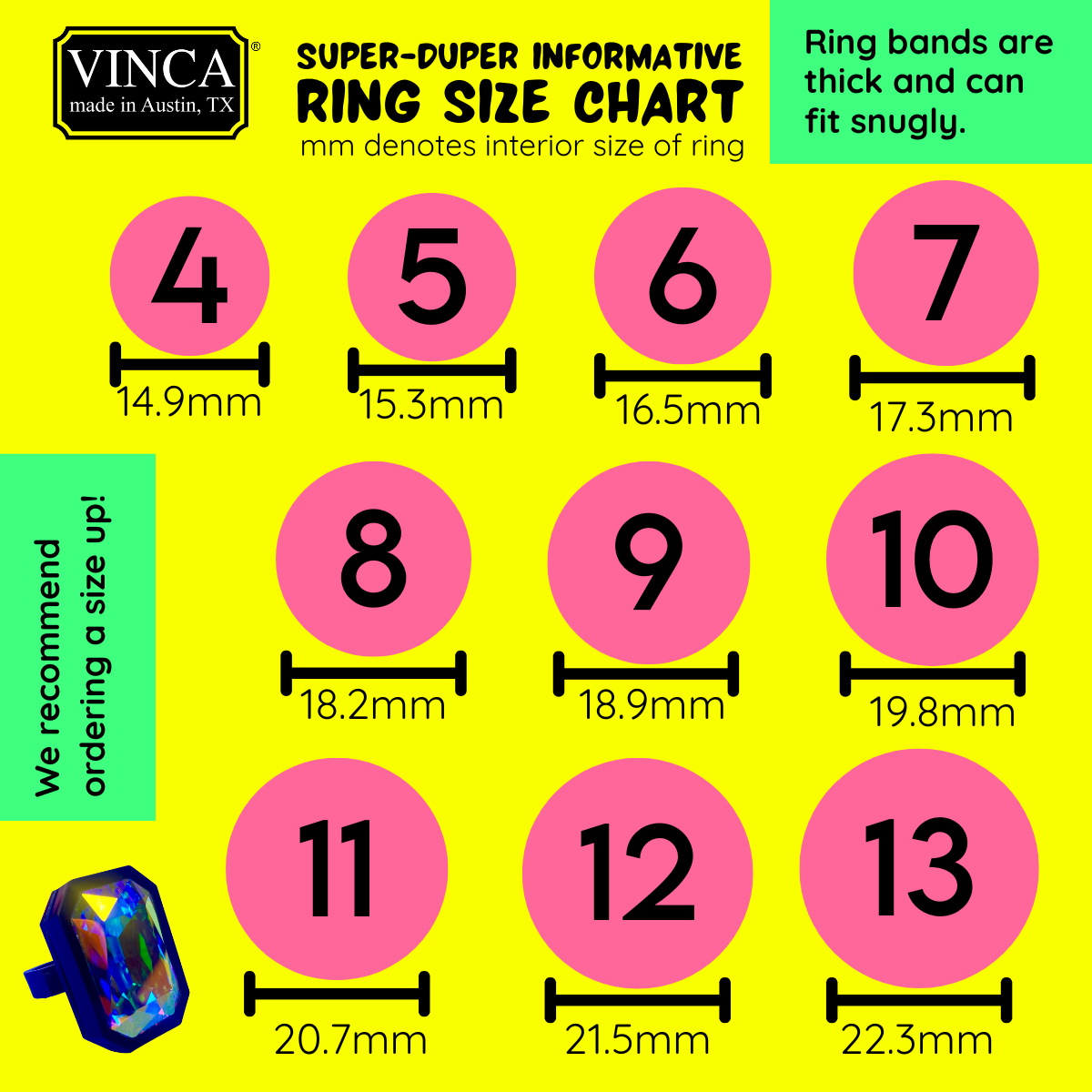 - Order a size up! Due to the chunky band, this ring fits very snugly. If you’re not sure, best to size up!