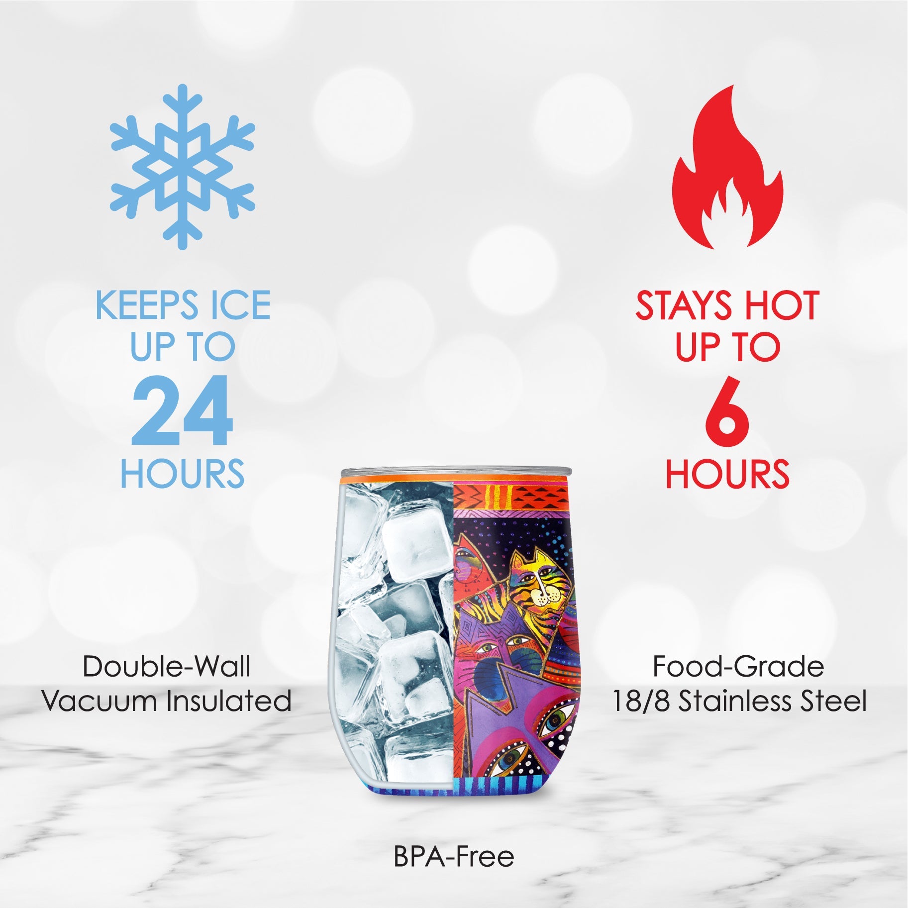Discover the perfect blend of style and practicality with our Stainless Steel Wine Tumbler. The sleek, modern design of this Tumbler makes it a fashionable accessory for any occasion. Whether you're hitting the gym, the office, school, or the trails, it's the perfect choice. This double-wall vacuum insulated Tumbler keeps beverages hot for 6 hours and cold for 12, keeps ice frozen for up to 1 day ensuring you're always refreshed. Crafted from durable, BPA-free 18/8 stainless steel, it's a sustainable and eco-friendly choice. The leak-proof design guarantees a mess-free experience, while the wide mouth simplifies cleaning. Elevate your hydration game, reduce waste, and enjoy hassle-free adventures with this travel-friendly companion.Our product features exquisite designs inspired by the timeless artistry of Laurel Burch. Burch's art is renowned for its vibrant colors, whimsical designs, and uplifting themes. Her unique style features bold patterns and fantastical creatures, celebrating joy, love, and the human spirit. Each piece of Laurel Burch art brings a sense of wonder and enchantment, making it a perfect addition to any collectionStunning rendering of Laurel Burch famous art, "Fantasticats." The design is captured with an artist's eye for detail, light & color.