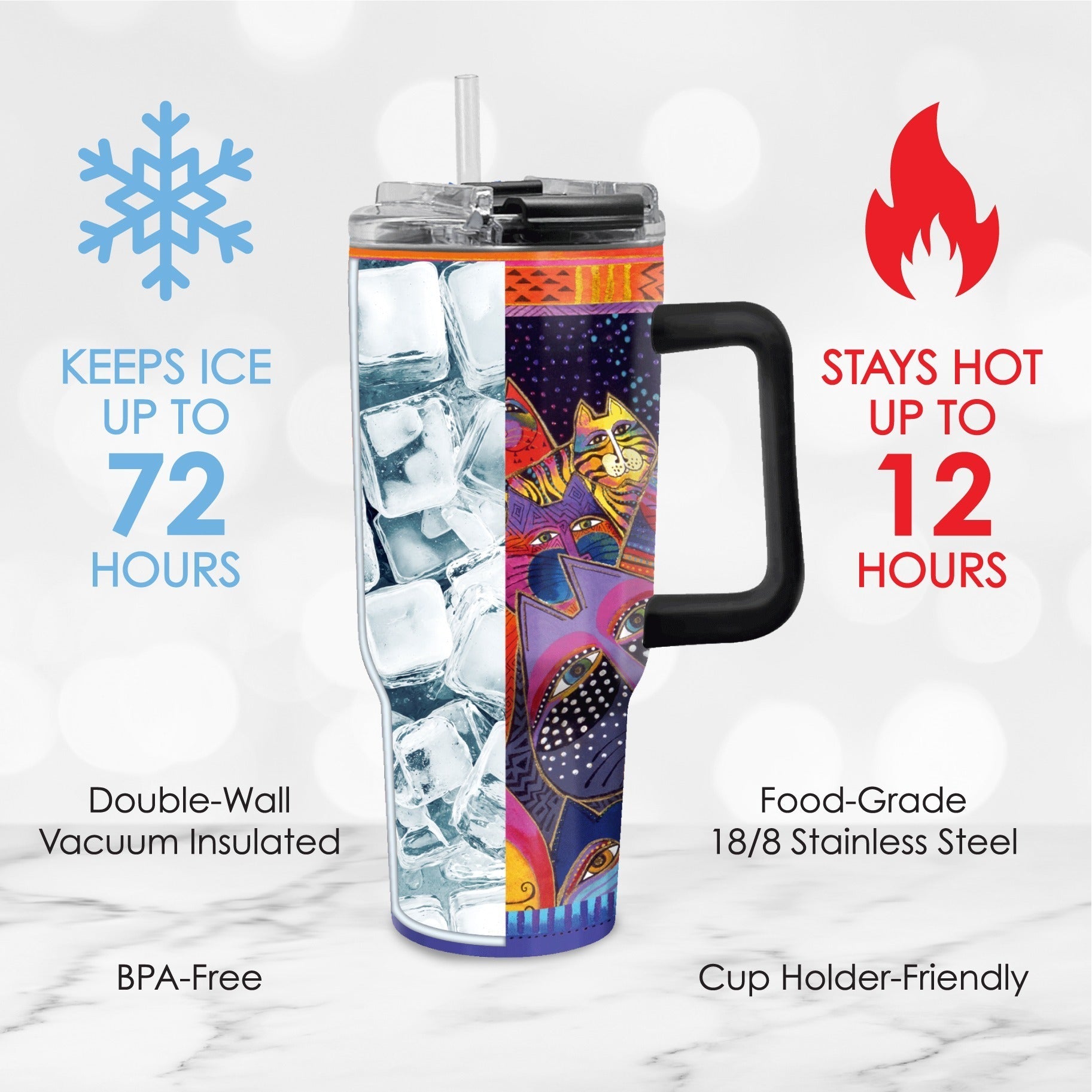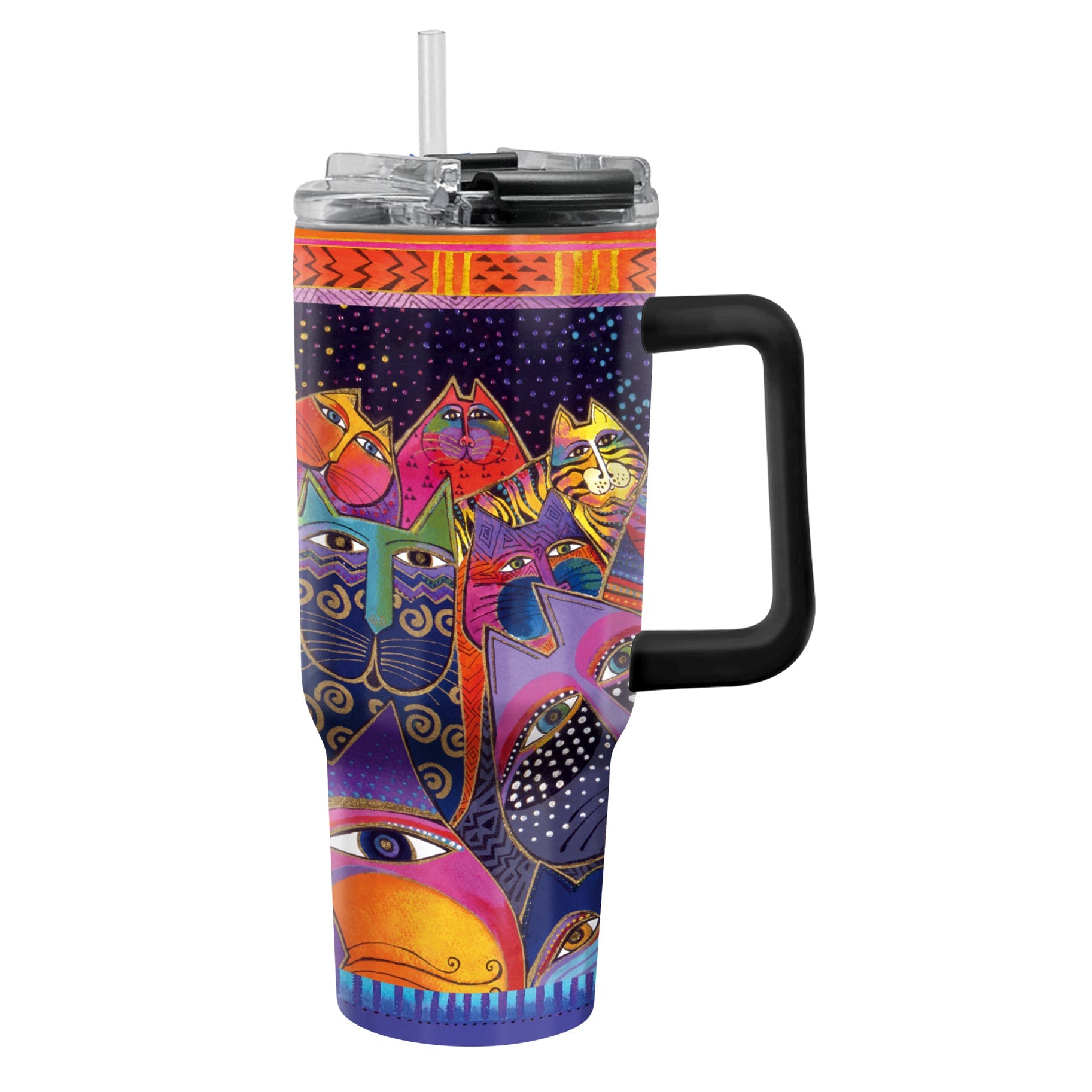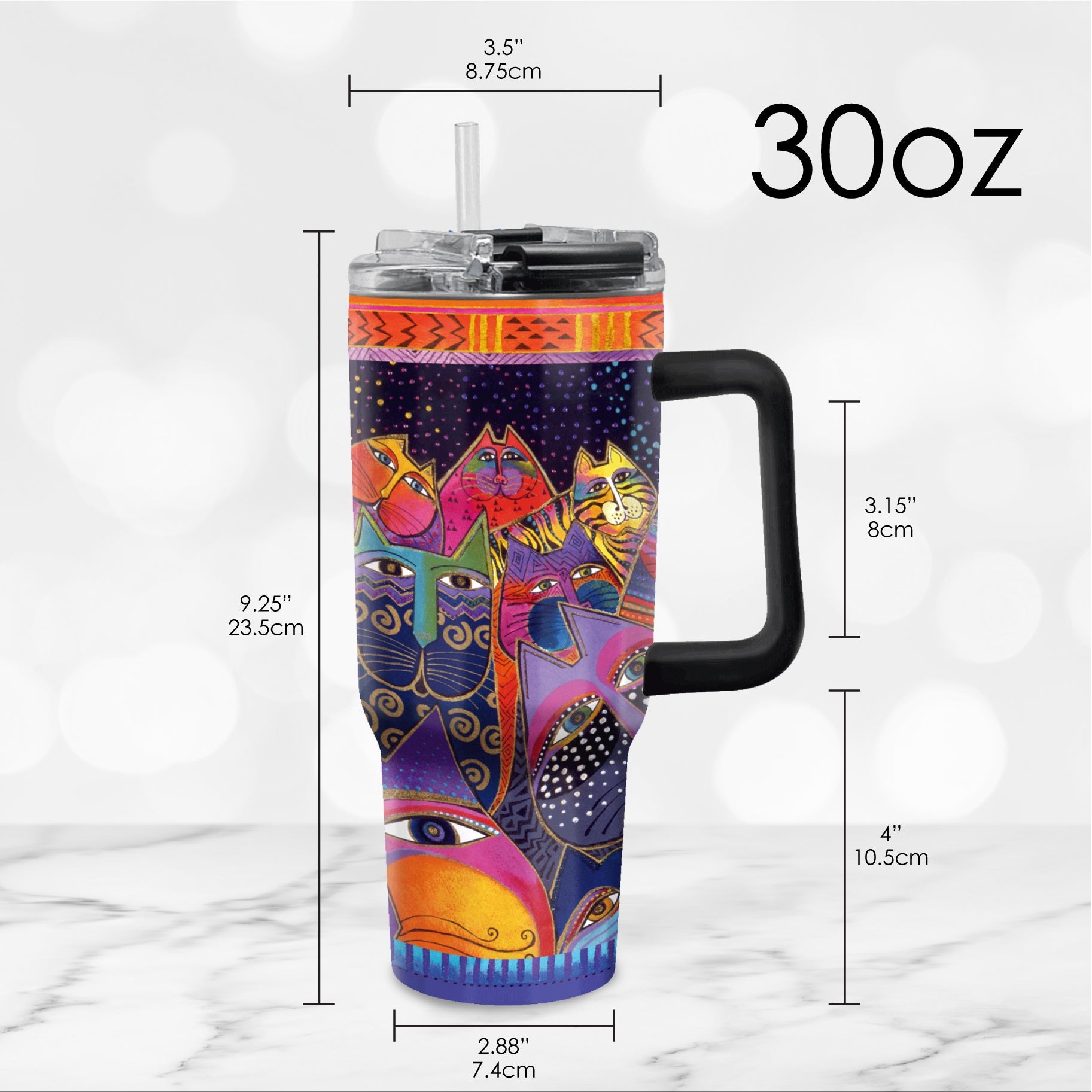 Stay Refreshed On-The-Go with Our 30oz Stainless Steel Tumbler!Discover the perfect blend of style and practicality with our Stainless Steel Tumbler. The sleek, modern design of this Tumbler makes it a fashionable accessory for any occasion. Whether you're hitting the gym, the office, school, or the trails, it's the perfect choice. This double-wall vacuum insulated Tumbler keeps beverages hot for 12 hours and cold for 36, ice up to 3 days ensuring you're always refreshed. Crafted from durable, BPA-free 18/8 stainless steel, it's a sustainable and eco-friendly choice. The leak-proof design guarantees a mess-free experience, while the wide mouth simplifies cleaning. Elevate your hydration game, reduce waste, and enjoy hassle-free adventures with this travel-friendly companion.Our product features exquisite designs inspired by the timeless artistry of Laurel Burch. Burch's art is renowned for its vibrant colors, whimsical designs, and uplifting themes. Her unique style features bold patterns and fantastical creatures, celebrating joy, love, and the human spirit. Each piece of Laurel Burch art brings a sense of wonder and enchantment, making it a perfect addition to any collectionStunning rendering of Laurel Burch famous art, "Fantasticats." The design is captured with an artist's eye for detail, light & color.