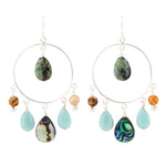These exquisitely handcrafted earrings feature stunning sterling silver circles adorned with amazonite and magnesite stones, as well as mesmerizing abalone stones. Measuring 1.5 inches in width and with a 3 inch drop from sterling silver fish hook ear wires, these earrings weigh 6.4 grams each. They are a must-have for anyone who appreciates the value of unique and beautifully handcrafted jewelry.