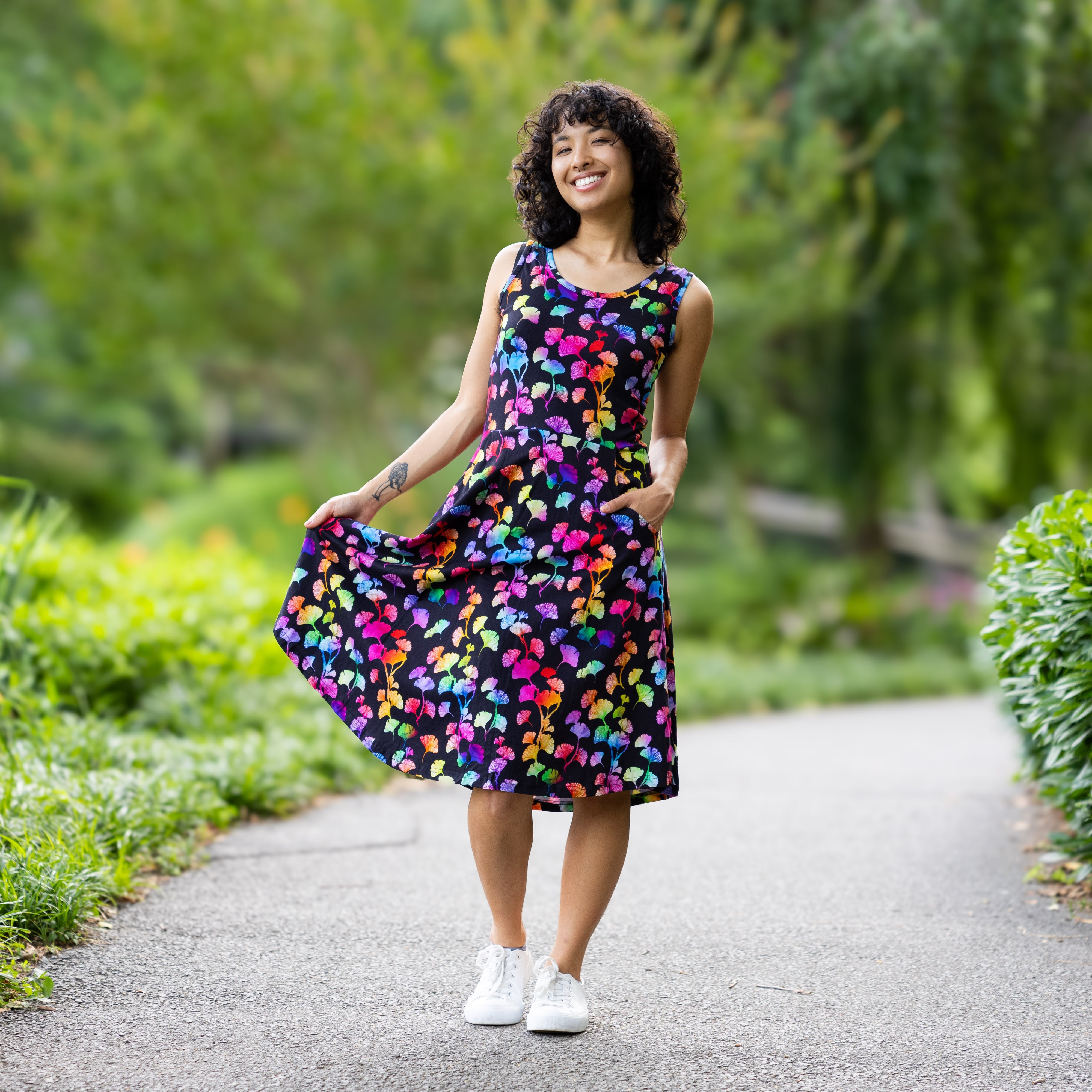 - Sleeveless, scoop neck, 1/2 circle twirl adult dress with pockets