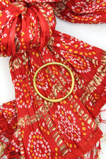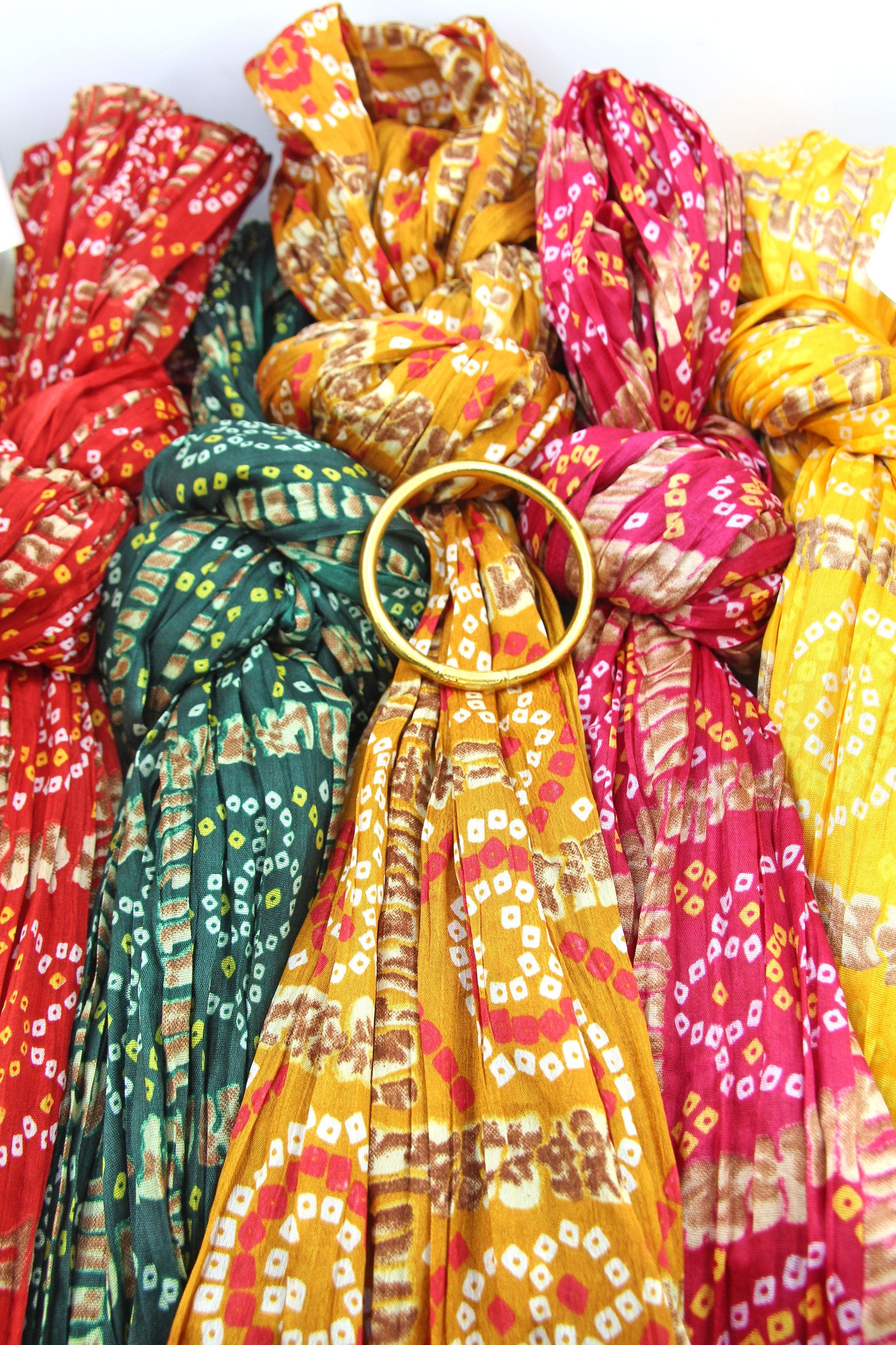 - Hand-dyed bandhani scarf, in your choice of 4 colors. Each scarf is a gorgeous display of color and no two are alike. These scarves measure approximately 40 x 84". They have a tasseled trim on the edges.