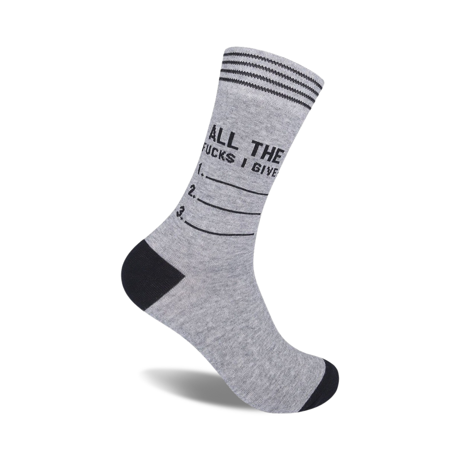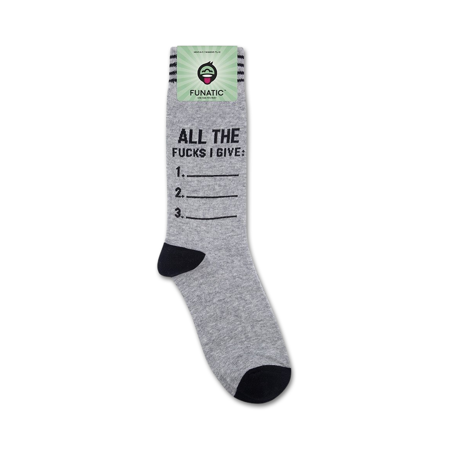 Get ready to elevate your sock game with All The Fucks I Give socks! Forget about boring old socks - these sassy crew socks are all about fun and expressing yourself. With their bold black text against a sleek gray background and three empty lines below, it's like you're making a list of all the cares you don't have. Show off your carefree attitude and let your feet do the talking. Whether you're a man or a woman, these unisex socks are perfect for anyone who loves to have a little cheeky fun.