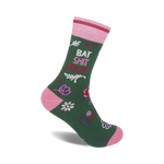 Who says socks can't be fun? These "Bat Shit Crazy" socks are not just any pair of socks. Imagine your feet frolicking on a lovely meadow, surrounded by pink flowers and vibrant leaves. But, here's the twist: there's bold red text in the middle of all this serenity that proudly proclaims "Bat Shit Crazy." These crew-length socks are all about adding a dash of humor to your outfit and making a statement every time you take a step. So, go ahead, embrace your wild side and let your socks do the talking!