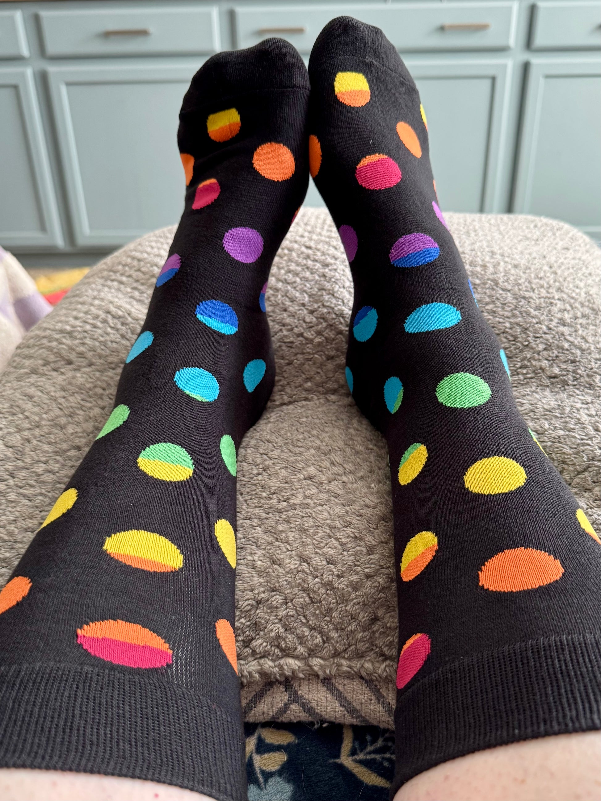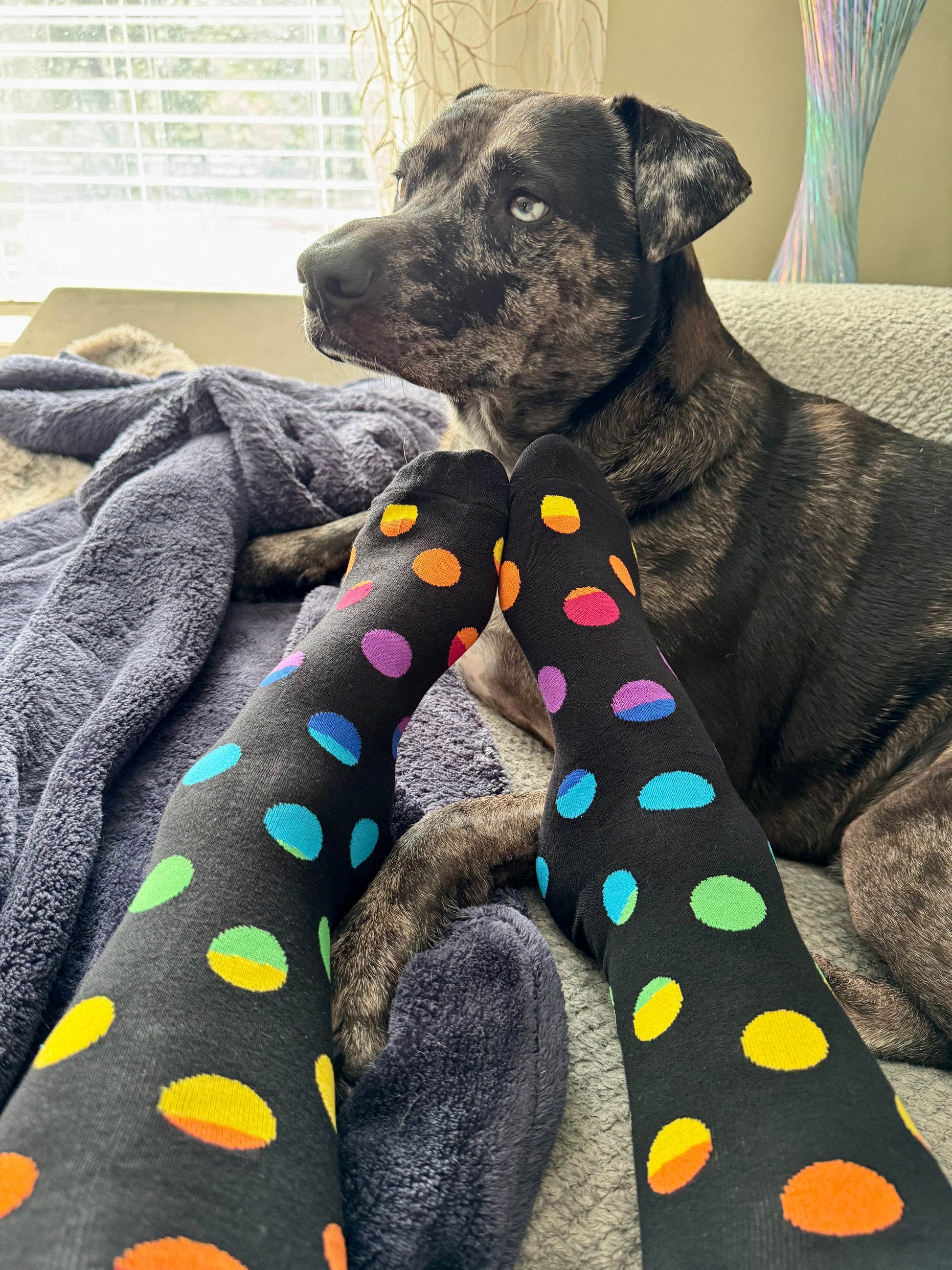 These soft, colorful socks will make your feet feel like they're in a rainbow wonderland. (Bacon says "Hi!")