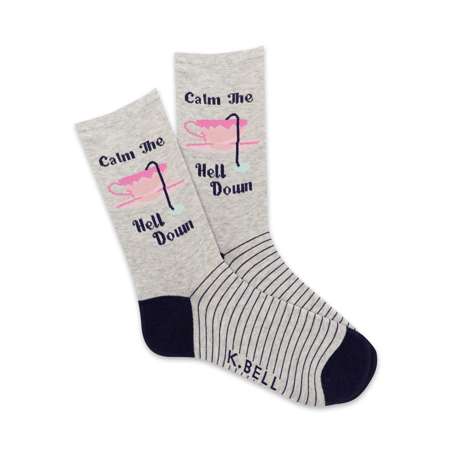 Calling all tea lovers and sassy queens! Slip into a pair of "Calm The Hell Down" socks and let the world know how you really feel. Featuring a gray background, vibrant pink teacups, and alternating pink and blue "Calm The Hell Down" text, these crew socks are the perfect blend of fun and sass. These socks will have you sipping tea and taking no prisoners. Grab a pair today and let your feet do the talking!