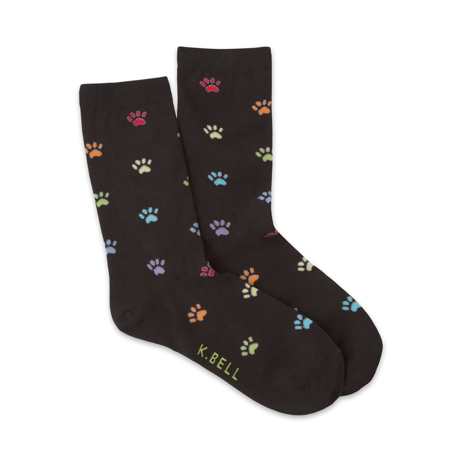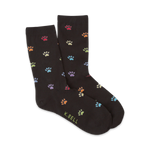 Take a walk on the colorful side and leave your paw print in the sands of life! This cool all black pair of crew socks will show off your love for vibrant colors and fuzzy things. Each fun novelty sock features an all over print of tiny paw prints in red, blue, orange, yellow, and purple.