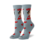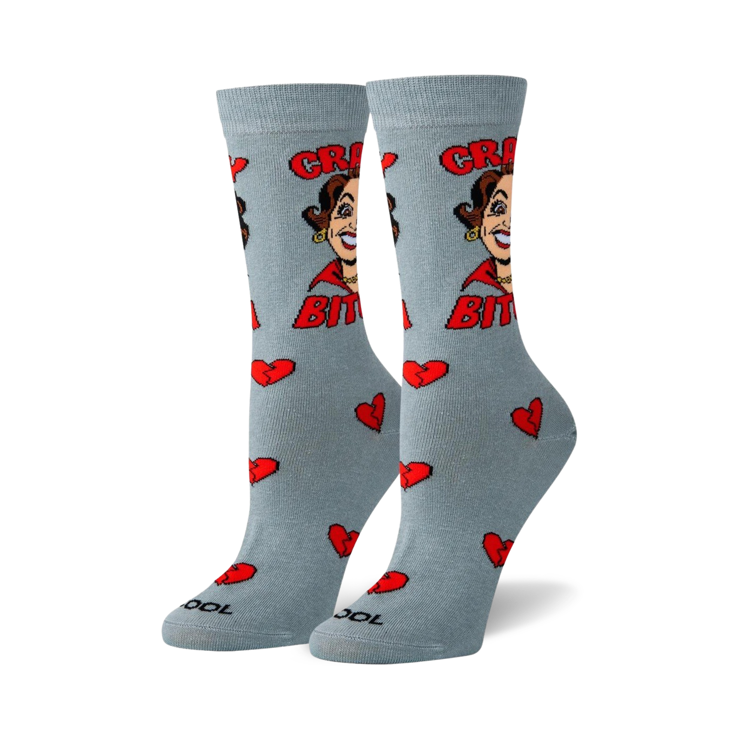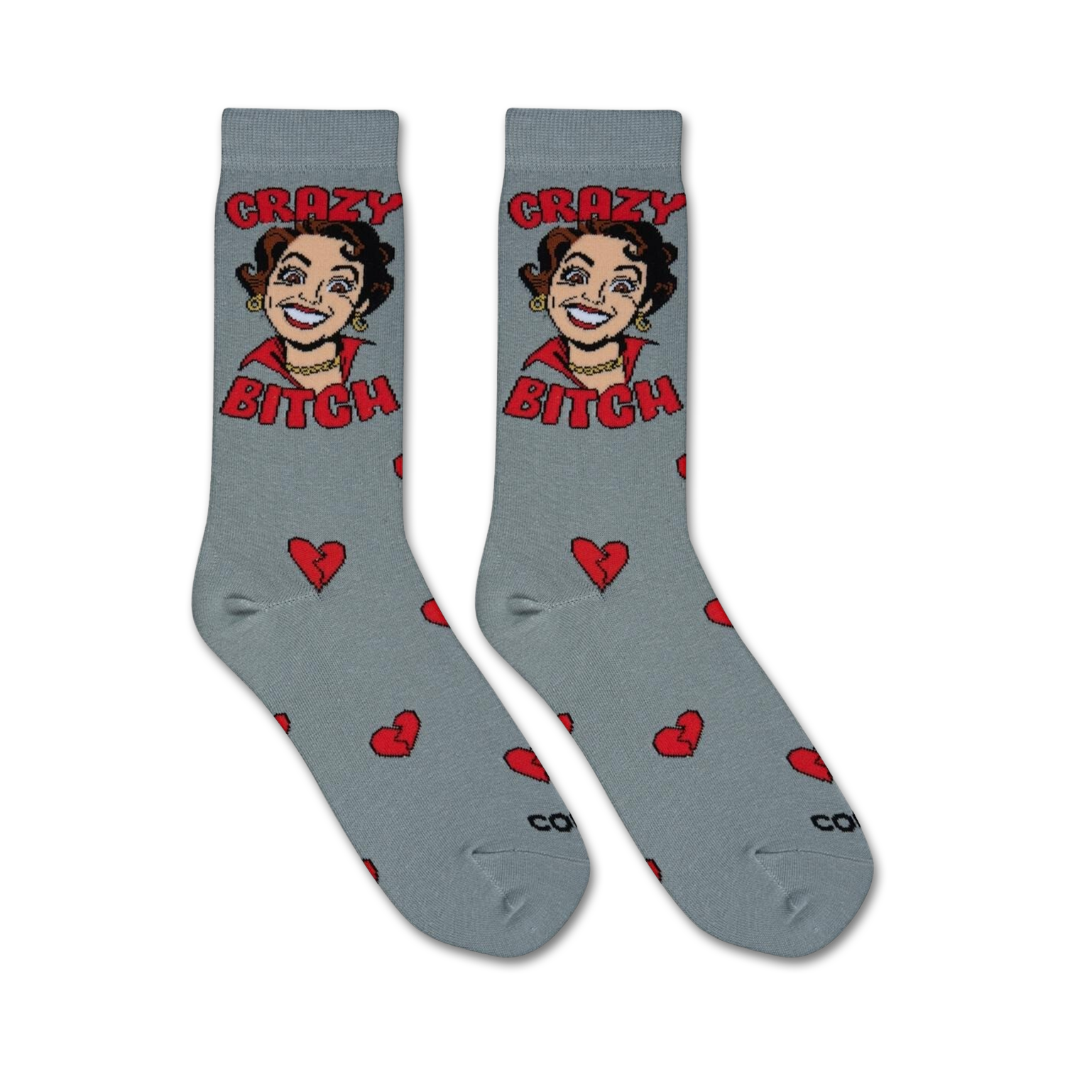 Meet our Crazy Bitch Crew Socks, the perfect pick-me-up for your wardrobe and your mood. These gray socks feature a pattern of red broken hearts and the words "crazy" and "bitch" in white. On each sock is a sassy lady with brown hair and red lips. They're sure to add a touch of fun and humor to your day, and remind you that even the toughest bitches can have a heart.