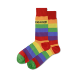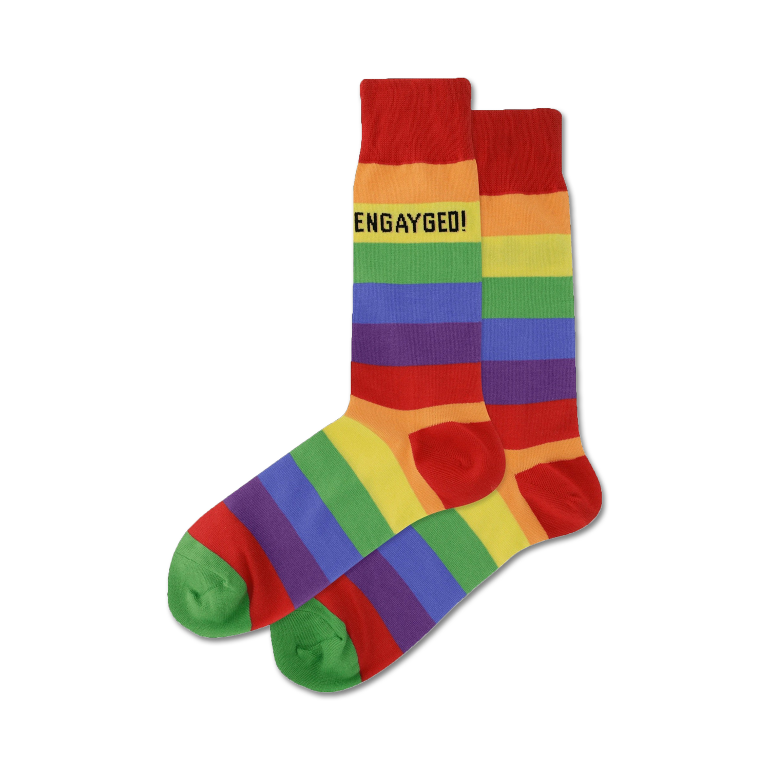 Engayged Socks: Show your pride and step out in style with our vibrant rainbow socks emblazoned with the word "ENGAYGED!" in bold black letters. These socks are a celebration of love, equality, and the LGBTQ+ community. With their green toes and heels, these socks are sure to turn heads wherever you go. So put on a pair of Engayged Socks and let your feet do the talking!