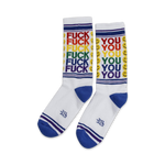 You've got the Shit Happens bumper sticker on your car. Now all you need are a pair of cheeky socks to match your outlook of life. Tell everyone who has ever screwed you over how you feel about them when you slip on a pair of these funny, outrageous socks. Each cool pair of women's novelty socks features the words FUCK on one side and YOU on the other. The words come in colors resembling a rainbow and there are happy faces printed next to them.