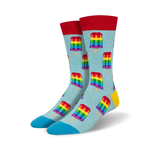 Celebrate your pride with these fun socks covered in a pop of popsicles in every color of the rainbow. From top to bottom, red, orange, yellow, green, blue, and purple popsicles on a blue background adorn these sweet kicks. The toe and heel are a solid blue, and the top of the sock is red. These medium crew socks make a gay-mazing addition to any outfit.