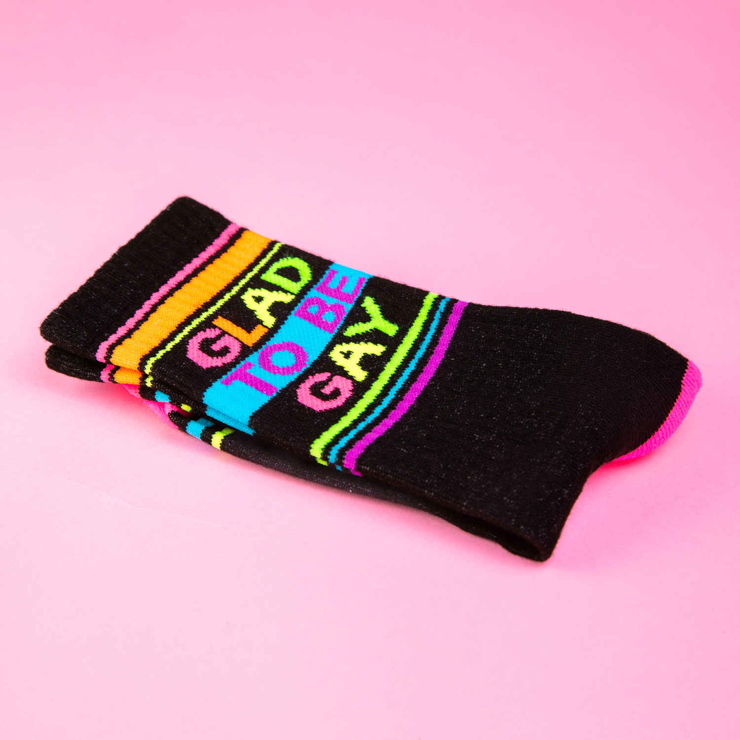 They say that pride comes before a fall, but not when these socks are on your feet. Glad To Be Gay socks bring a pop of color and a playful spirit to your feet with rainbow-colored lettering and colorful stripes. Whether you're showing your Pride, or simply loving who you are, put your feet up and celebrate the beauty of love and acceptance with these awesome new socks. And if anyone has a problem with them, you can politely ask them to take a hike.