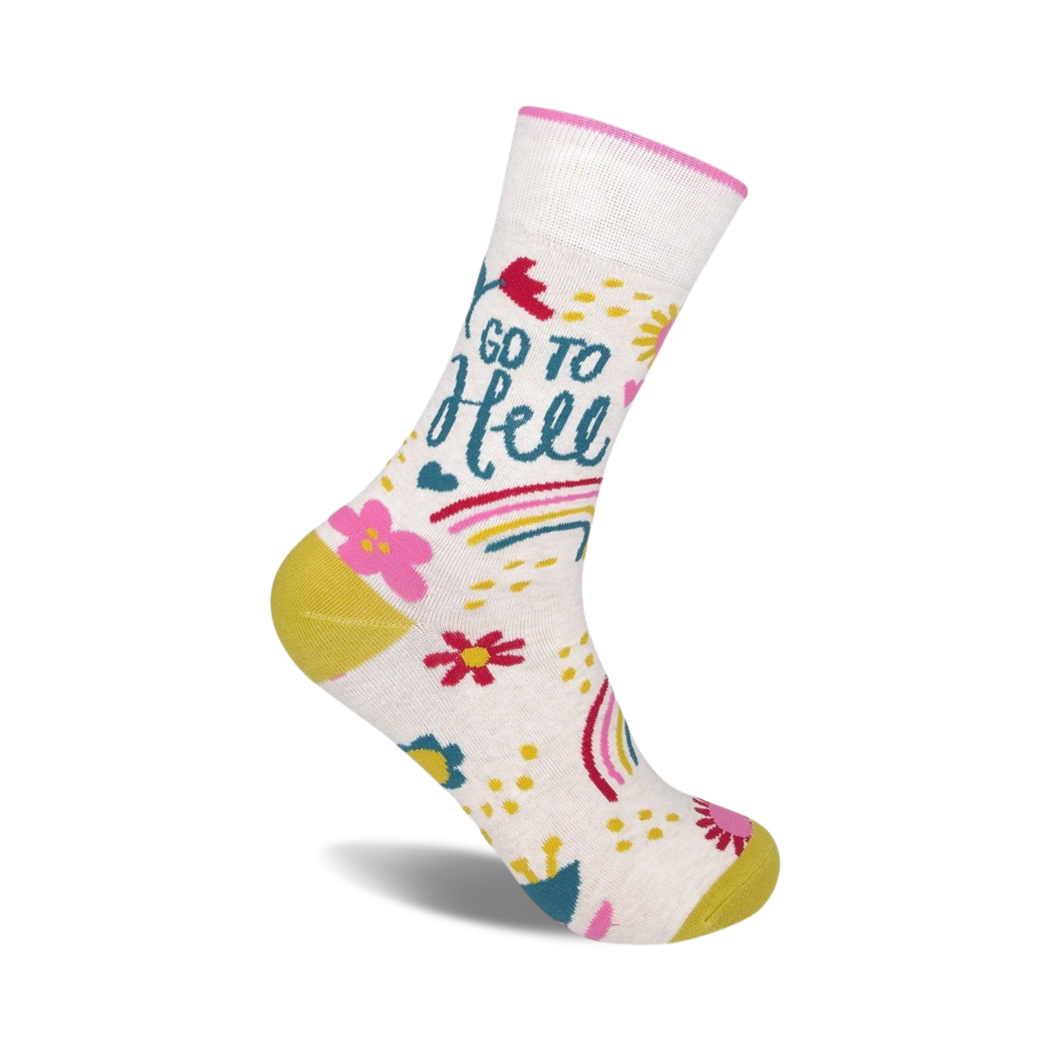 These "Go To Hell" socks are a charming and sassy accessory that will leave you saying, "Heavens to Betsy!" and not because granny's in the room. With a cottony soft base topped with a blue and green "Go To Hell," these babies will make even your feet smile. Toss in some flowers, rainbows, and a touch of cheekiness, and you'll be ready for a ride on the wild side...or at least to the mailbox in style. So next time someone asks where you're off to, you can tell them straight, "Go To Hell, I'm wearing my Go To Hell Socks!"