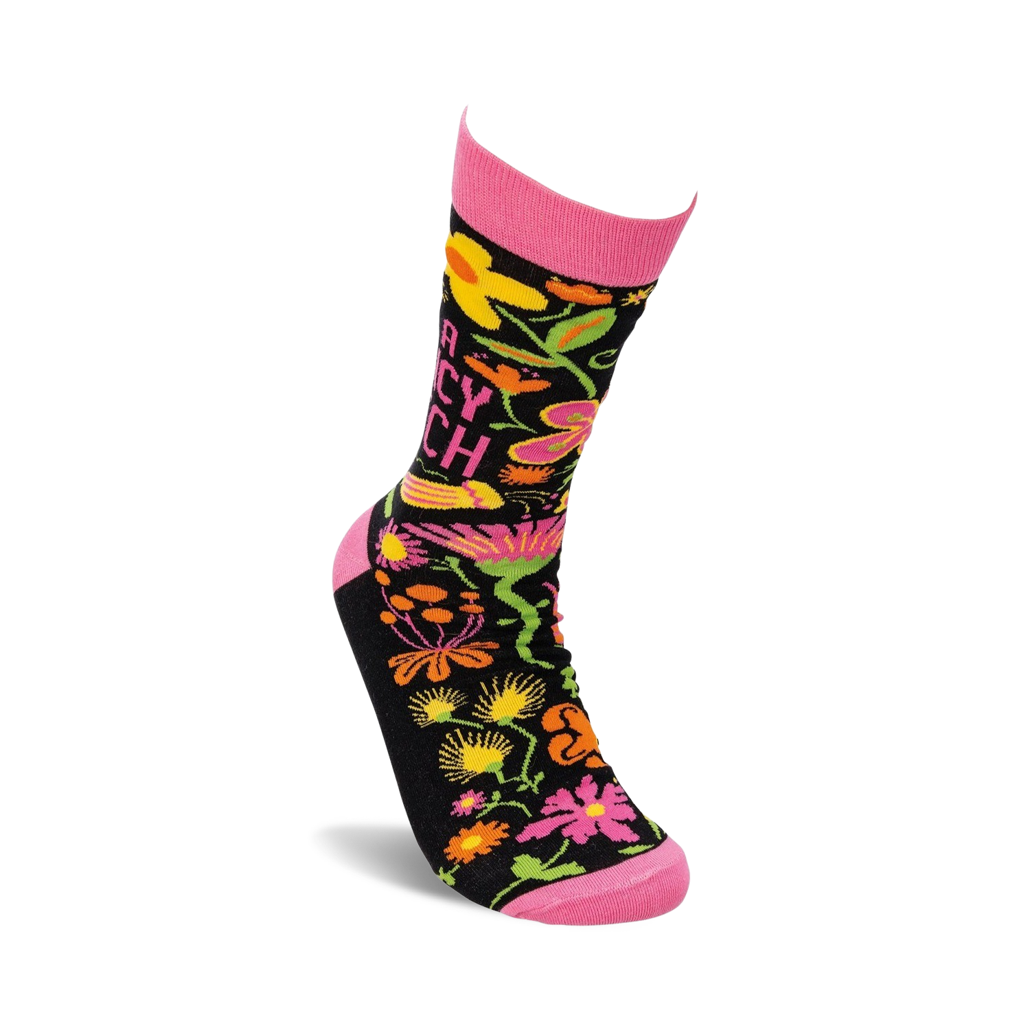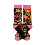 Black crew socks with bright, colorful floral patterns and hot pink toes and heels show off your wild side, whether you're a fancy b!tch or just a b!tch who likes fancy socks. Don't be a total square, wear these socks and show everyone that you have a wild side, literally.