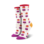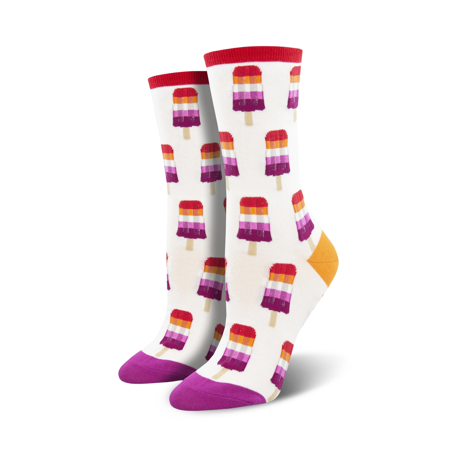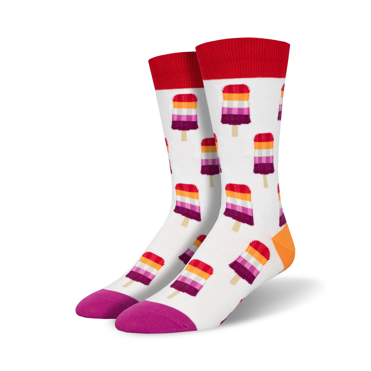 Popsicles are cool, refreshing and a beloved summertime snack! Just thinking about them might make your mouth water and give you a brain freeze! But did you know that popsicles are also a symbol of lesbian pride? That's right! People have been using everyday mundane objects to represent, signal, and even celebrate LGBTQIA+ pride. These soft, stretchy, crew length socks are emblazoned with juicy, mouth-watering popsicles in pink, purple, blue, yellow, and orange. They're perfect for your next pride parade or just to wear around the house to celebrate your queer identity.