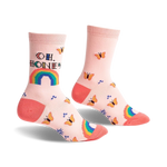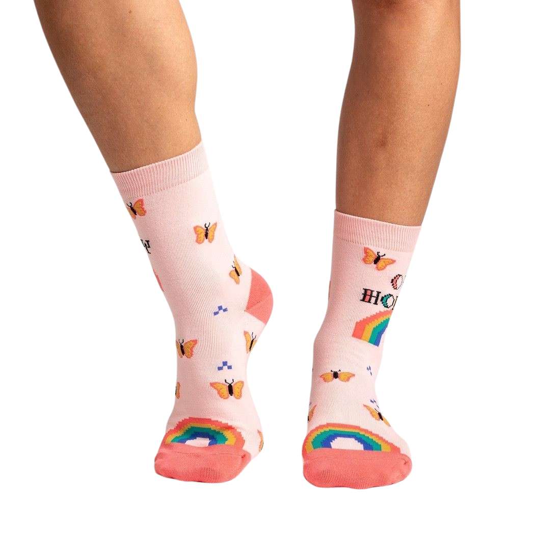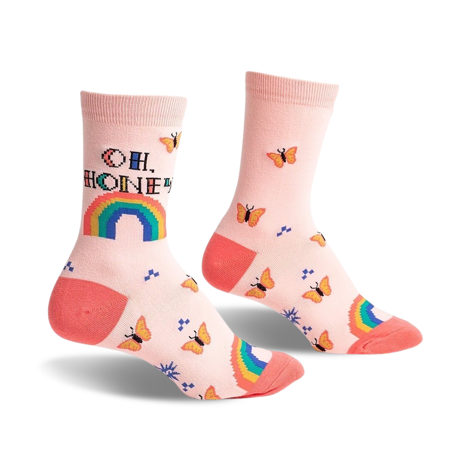 Say Oh, Honey to these cottony-soft crew socks with rainbow-adorned pixel butterflies. Pair them with your favorite outfit and become a bee-autiful pollinator wherever you go! They're the bee's knees and make great gifts, too.