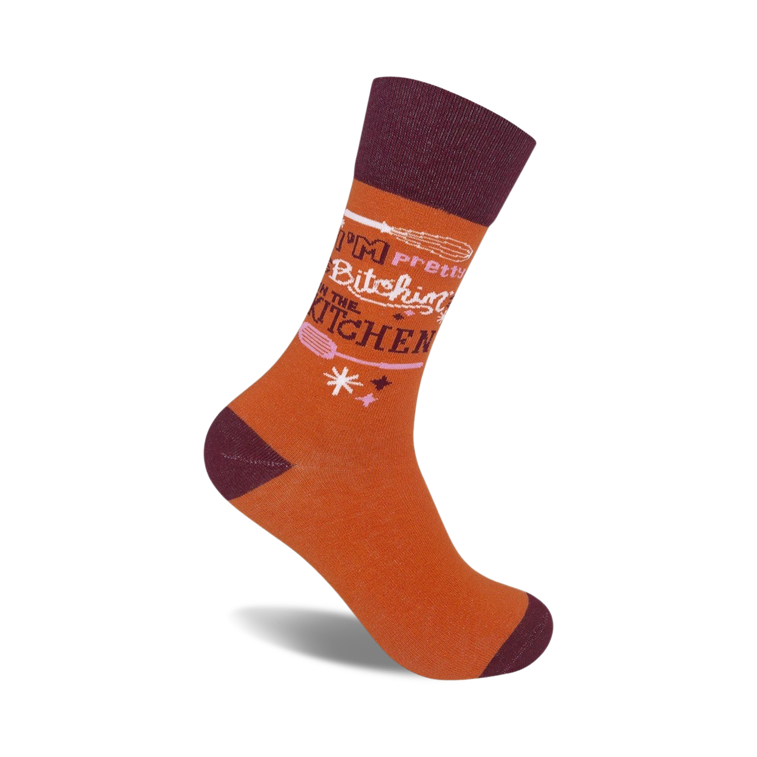 Are you a total rockstar in the kitchen? Then these socks are for you! Show off your culinary prowess with a pair of "Pretty Bitchin' in the Kitchen" socks. With bright orange fabric and a whisk illustration, they're sure to turn heads. Plus, they have the words "I'm Pretty Bitchin' in the Kitchen" written on them, so everyone knows you're serious about cooking.