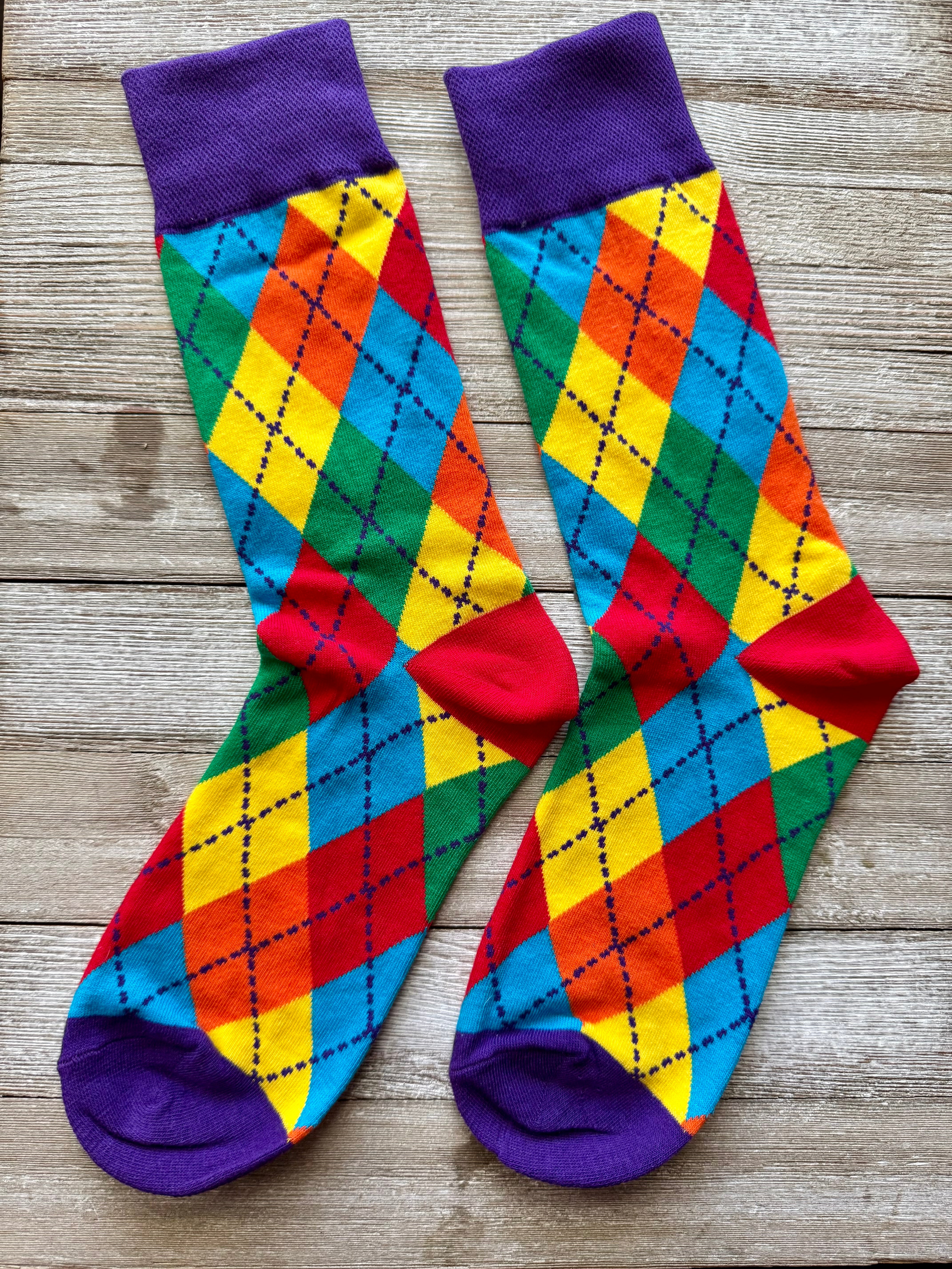 Everyone likes rainbow socks, they're a classic. These are the crew version of our Rainbow Argyle Ankle Socks.