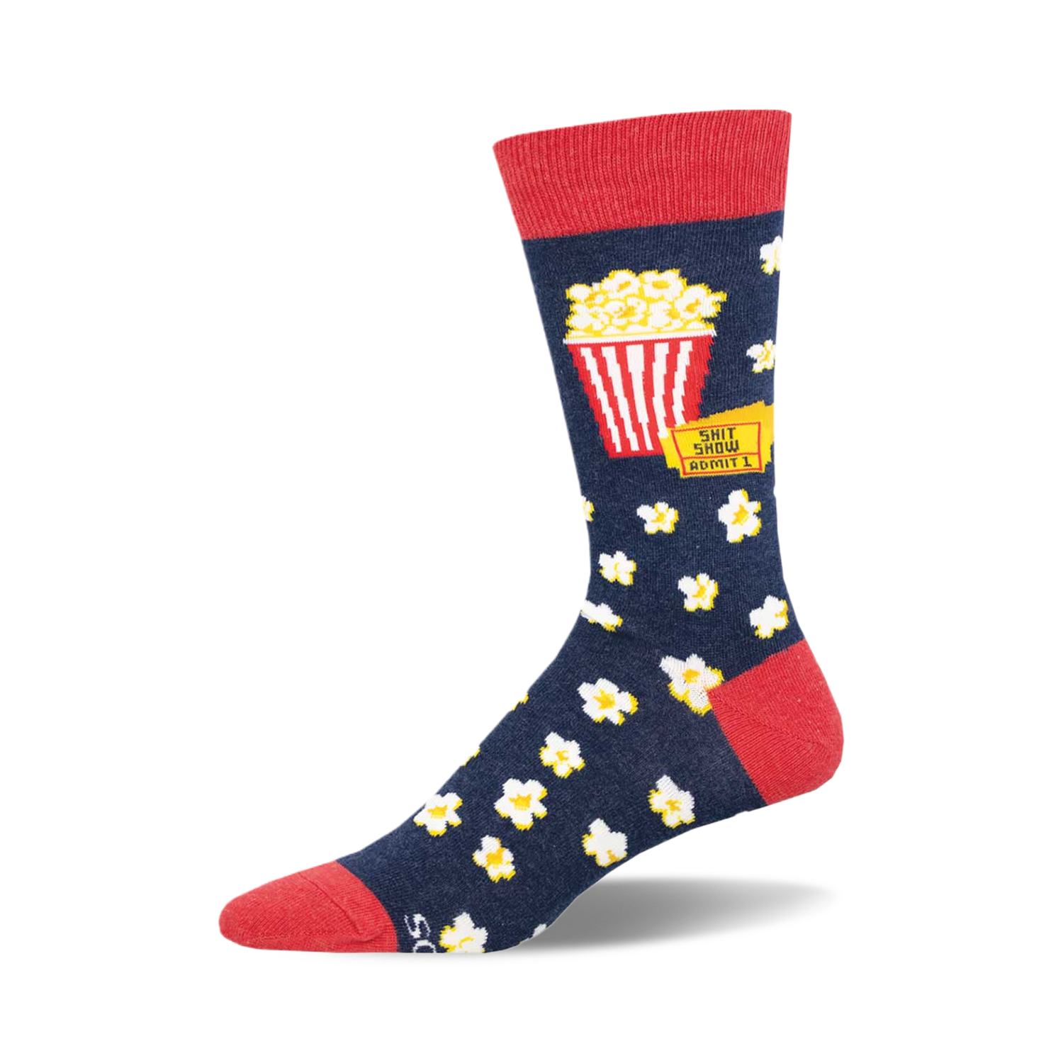 Are you ready to showcase your flair for the dramatic with our daring "Shit Show" socks? Painted in vibrant blue, with a fiery red cuff, these crew-length dazzlers feature a striking red-and-white striped popcorn bucket because every popcorn-worthy debacle deserves its own highlight reel. Sprinkled around are whimsical white popcorn kernels that set the scene perfectly for your next blockbuster event or just a hilariously harrowing day at the office. Let's face it, everyone loves to see you kick up some drama in style. Wear them to your next movie night or gift them to the friend who's always ready for a good plot twist. Haven't you been waiting for your moment in the spotlight?