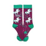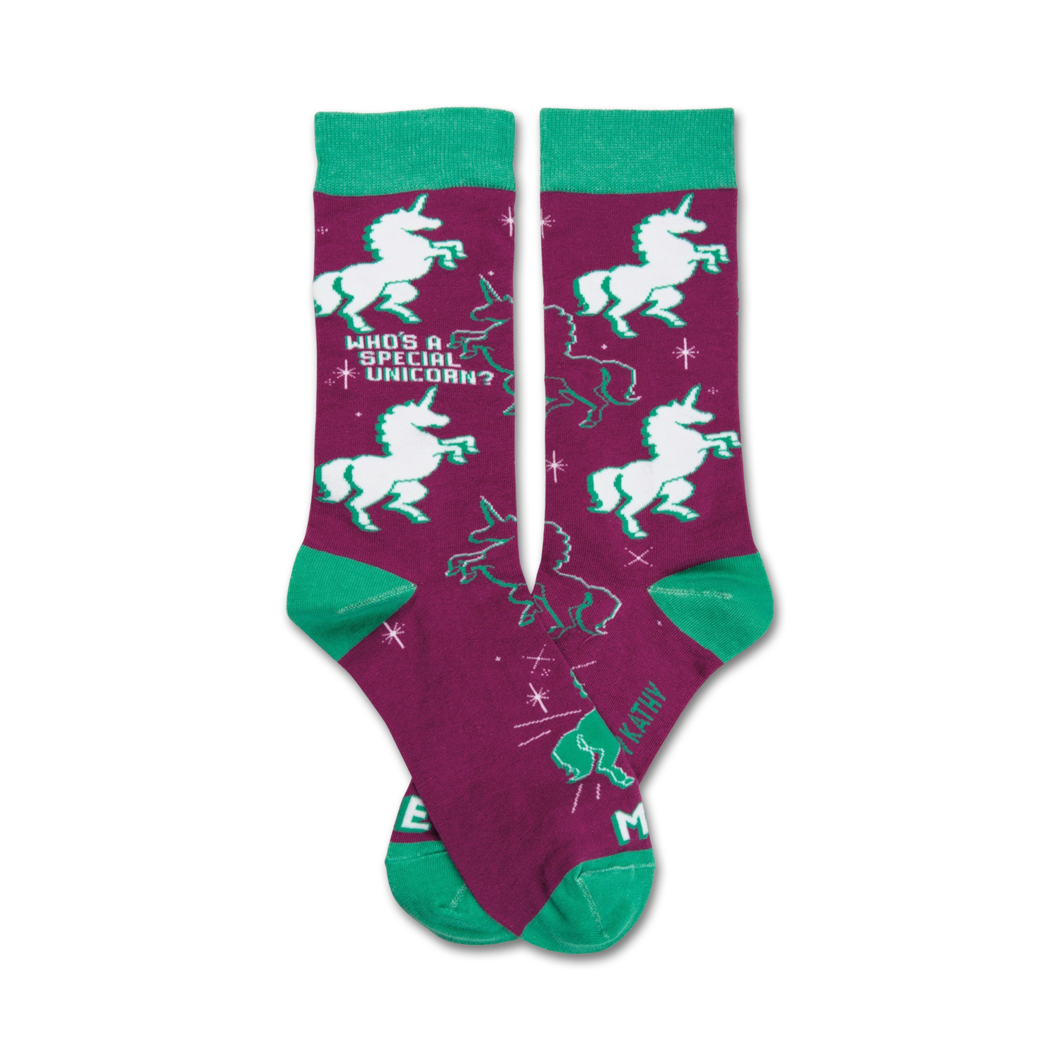 Unicorns are usually depicted as majestic creatures, far from everyday life. Our Special Unicorn socks bring that magic closer, with a vibrant pattern of prancing unicorns against a starry purple backdrop. On the green cuff, the question "Who's a special unicorn?" is posed, answered by the green toes and heels: "Me!" These women's crew socks will add a touch of whimsy to your day and a smile to your face.