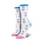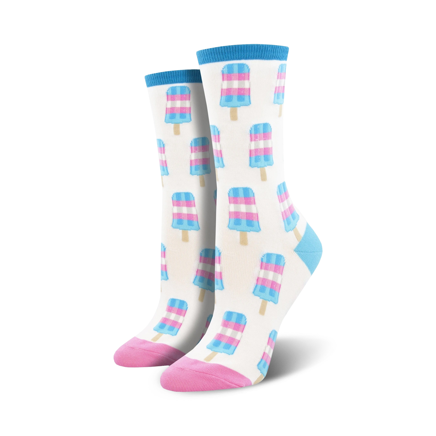 Fun Trans Pops Crew Socks: Step up your sock game with Trans Pops Crew Socks! These playful socks feature a bold pattern of popsicles in shades of pink, blue, and white, splashing across your feet like a rainbow. With pink toes and heels and blue cuffs, these socks are a sweet tribute to the LGBTQIA+ community. Grab a pair and flaunt your pride, one popsicle-print at a time!