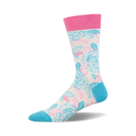 Picture your feet draped in a garden of pink and blue roses! Our "Trans Roses" socks are not just a treat for the eyes, they bring a vibrant splash of floral elegance right down to your toes. Featuring a fun play of colors with pink tops, blue bottoms and toes, and enchanting light green leaves, they are perfect for adding a pop of color and style to any outfit. Whether you're jazzing up your office wear or adding flair to casual hangouts, these crew-length socks are just the thing. Need a unique gift idea or planning to brighten up your sock drawer? Look no further!