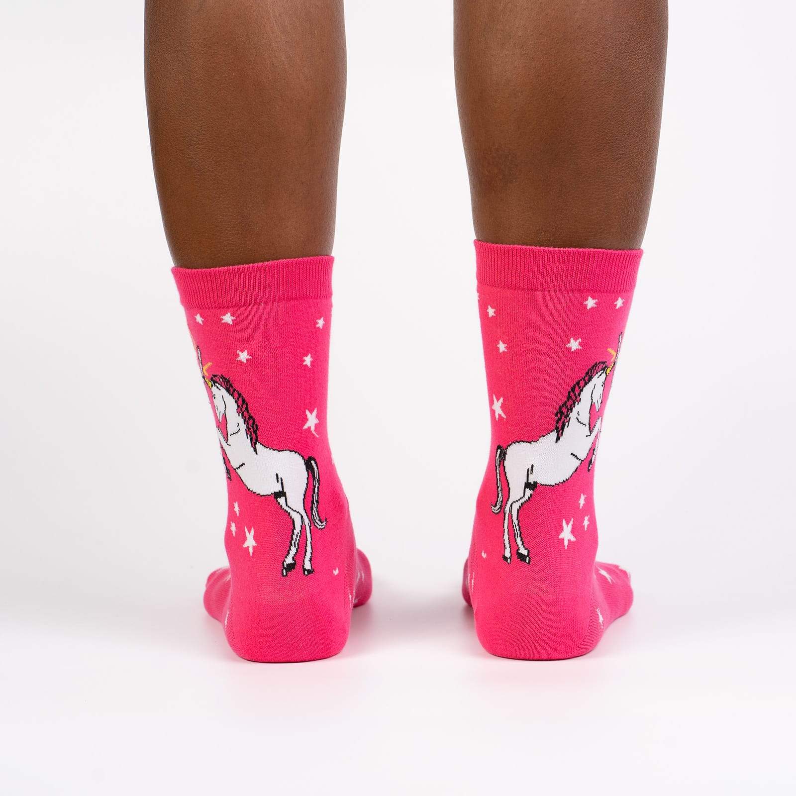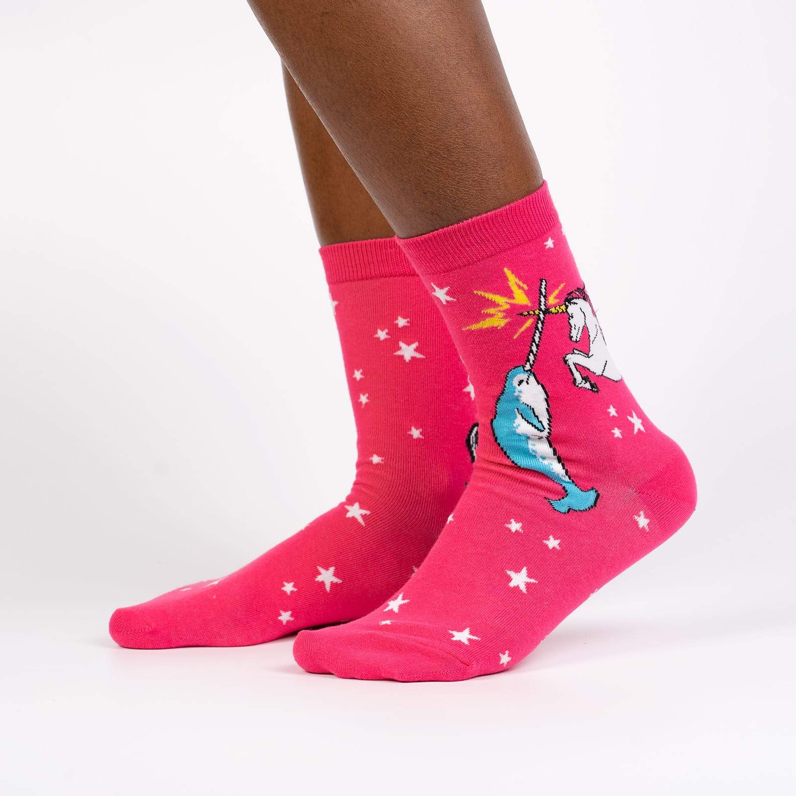 These crew socks are hot pink with white stars and feature a whimsical scene: a unicorn and narwhal battling it out with a sparkly horn-to-horn clash! The visible portions show a bright, colorful design. They're comfy, fun, and perfect for adding a touch of mythical mischief to your everyday outfit. The pink is vibrant, and the unicorn and narwhal are clearly the stars of the show, along with the little white stars sprinkled on the sock itself.