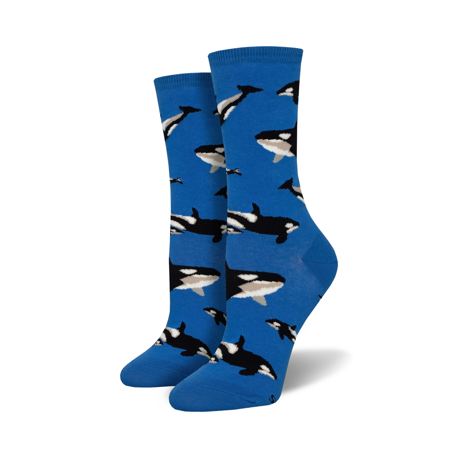 Whale Hello There! Splash into the deep blue with these fin-tastic orca socks. With their majestic black and white design against a vibrant blue background, these socks are sure to make a splash wherever you go. Super soft and comfy, these whale-come additions to your sock drawer will have you feeling like you're swimming with the orcas!