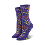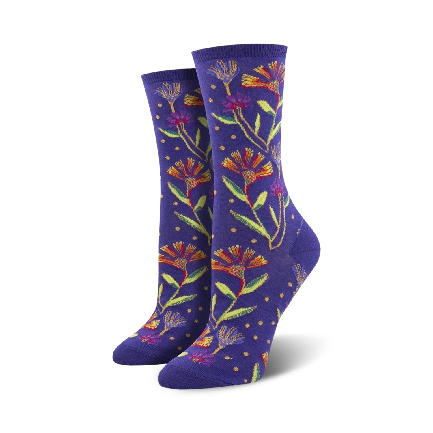 These 'Wildflowers' socks are a vibrant purple, covered in a pretty pattern of stylized flowers and small dots. The flowers shown are orange-yellow-red and purple, with lime green stems. They look like a fun, cheerful print- perfect for adding a pop of color to your day. The visible portion of the socks is crew length. They're comfy enough for all-day wear, but stylish enough to show off.