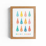 Brighten up the holidays with this MERRY MERRY card in hand illustrated RAINBOW BOTTLE BRUSH TREES.