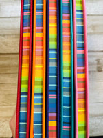 The five-notebook set includes one of each color (red, orange, teal, pink, purple). Each hardcover notebook measures 5.75 x 8.35 inches and contains 212 pages of lined off-white paper. They lay flat when opened, have elastic closures and a built-in ribbon bookmark.