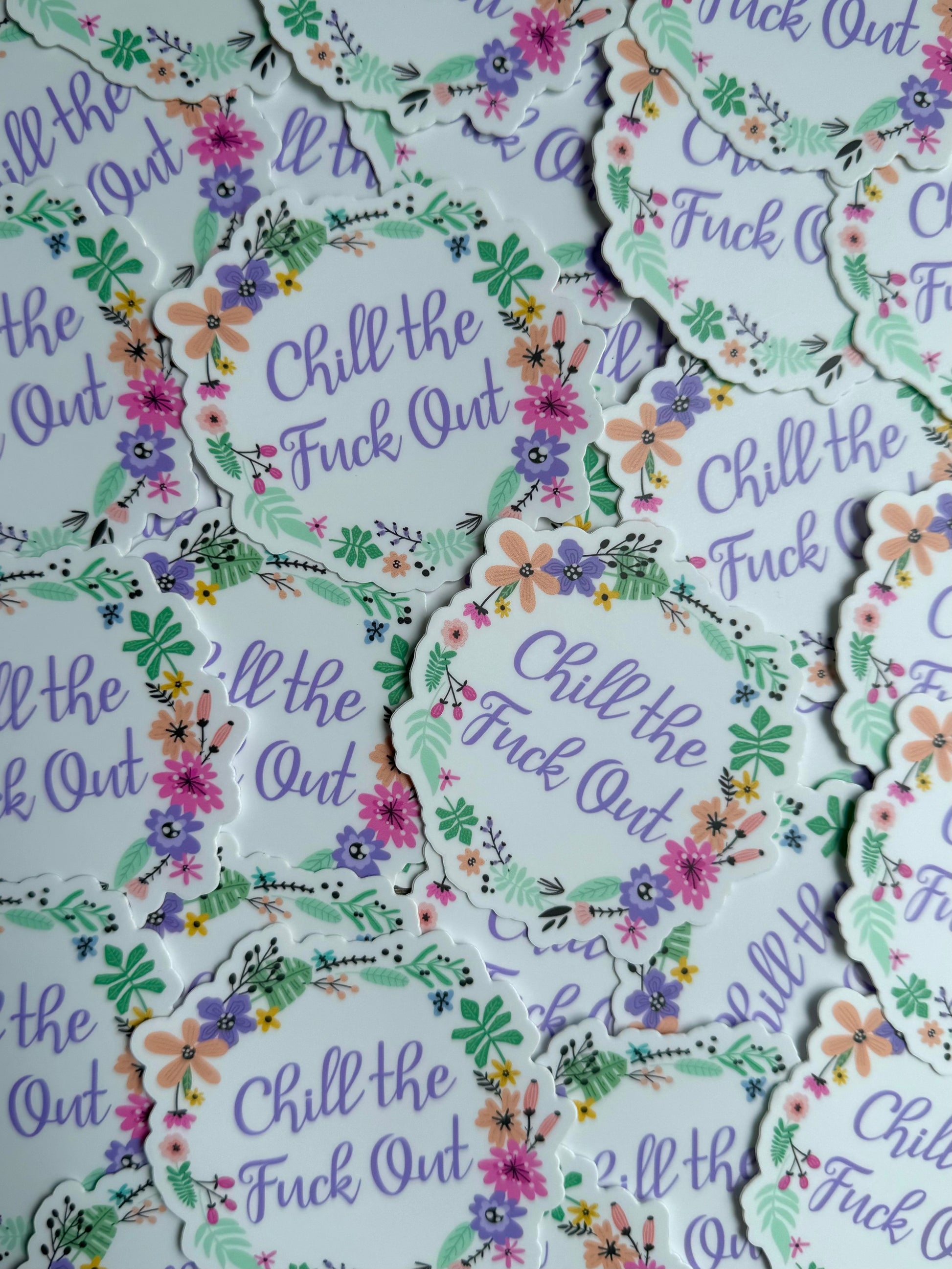 These colorful word art stickers feature a pretty floral wreath with a classy script reminder that you need to chill out.
