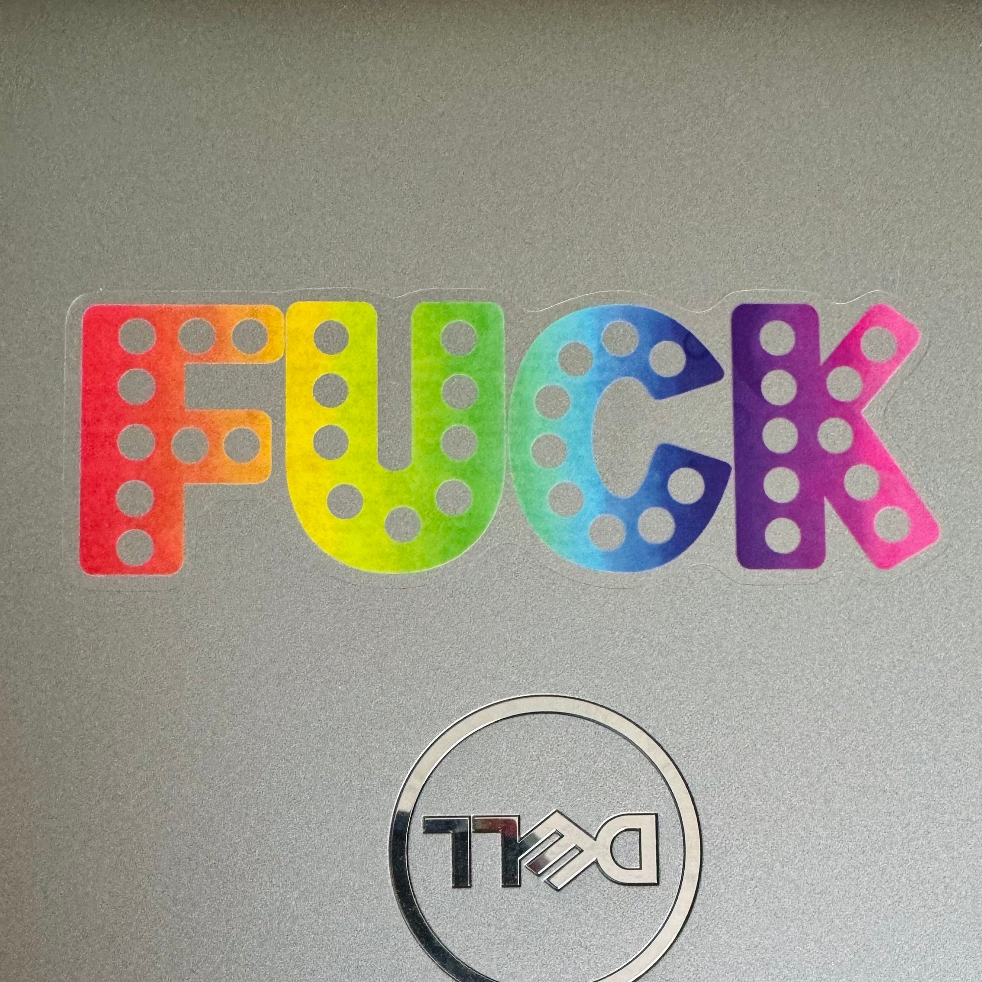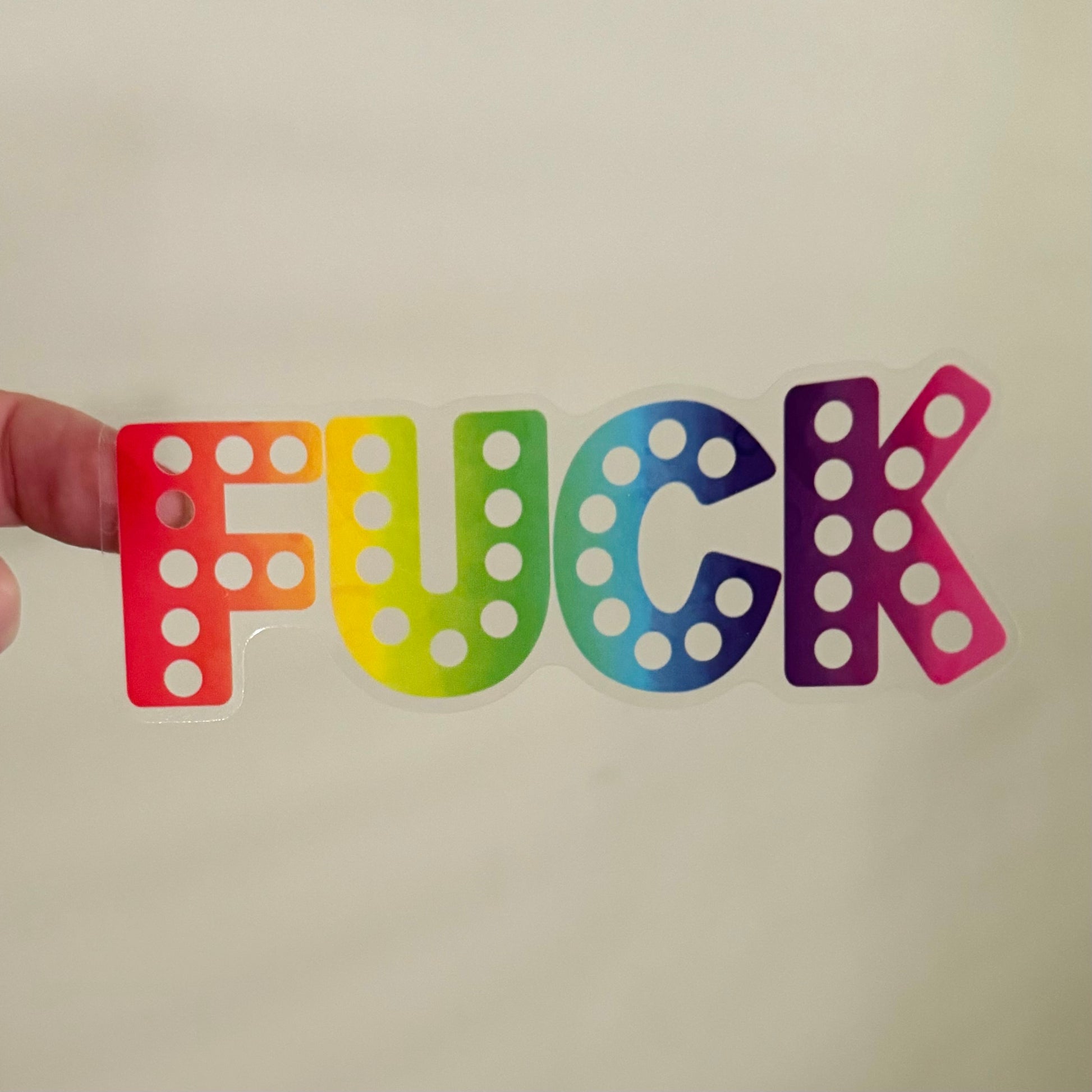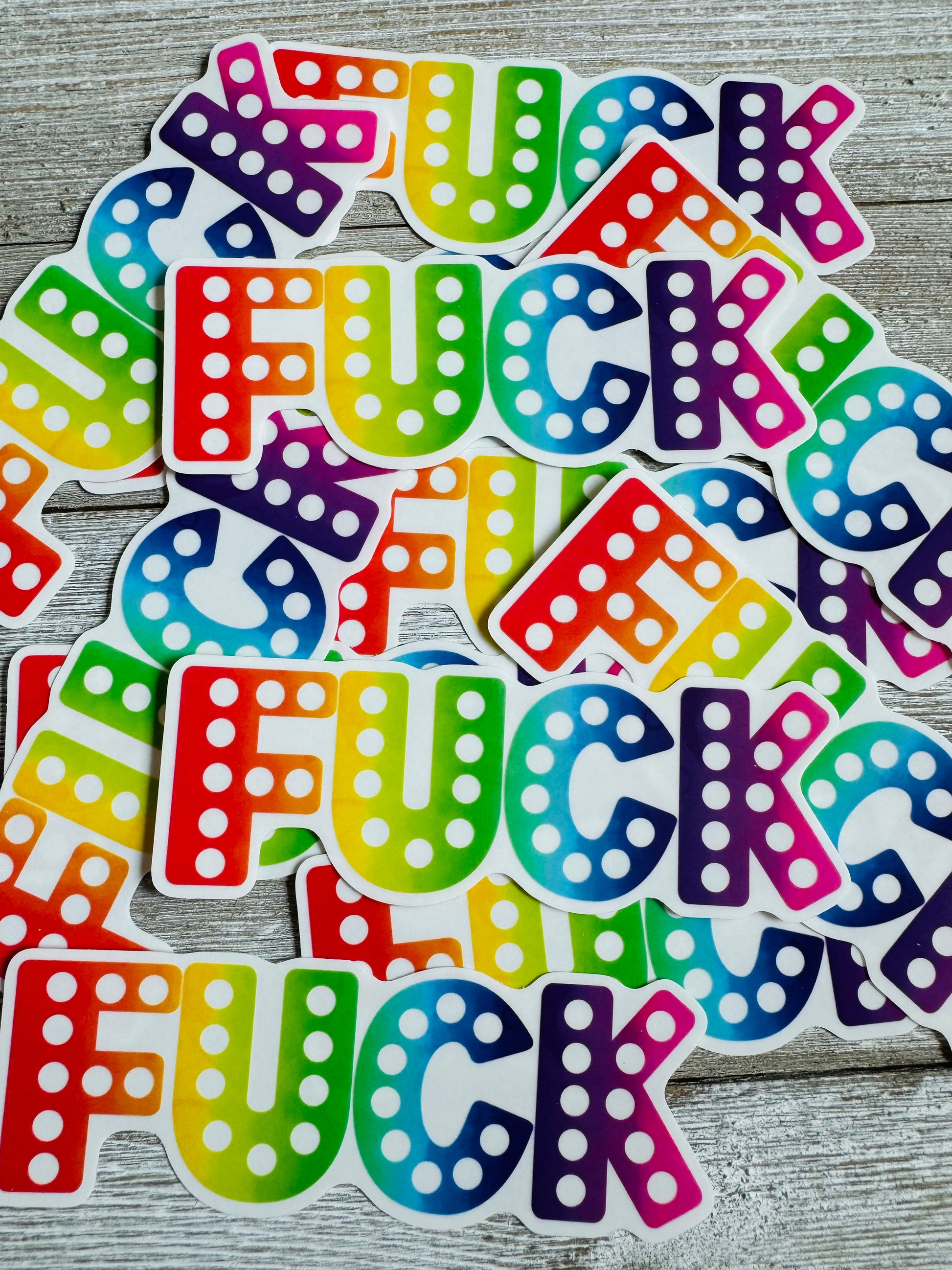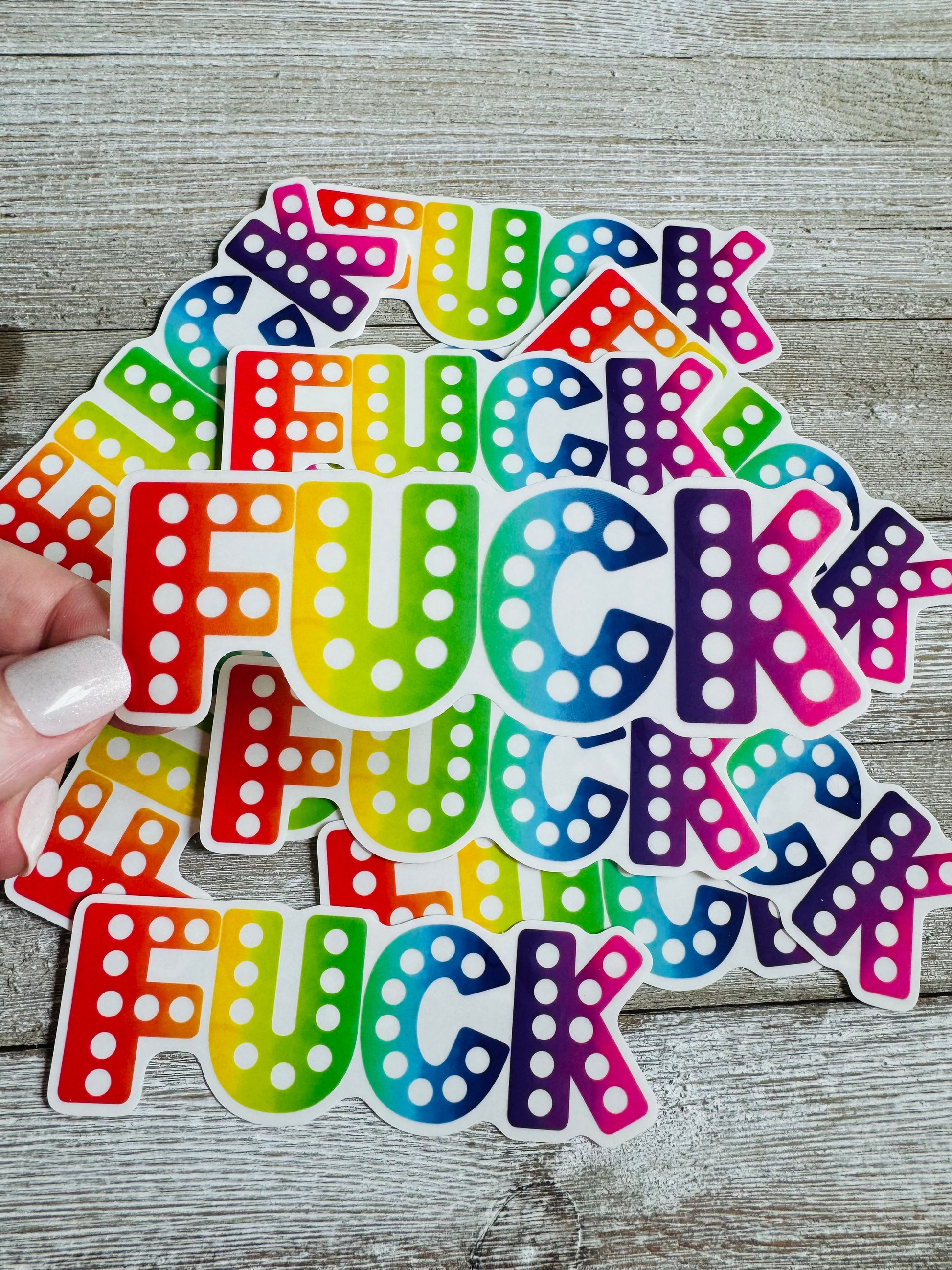 These colorful word art stickers feature a rainbow gradient text with clear dots.